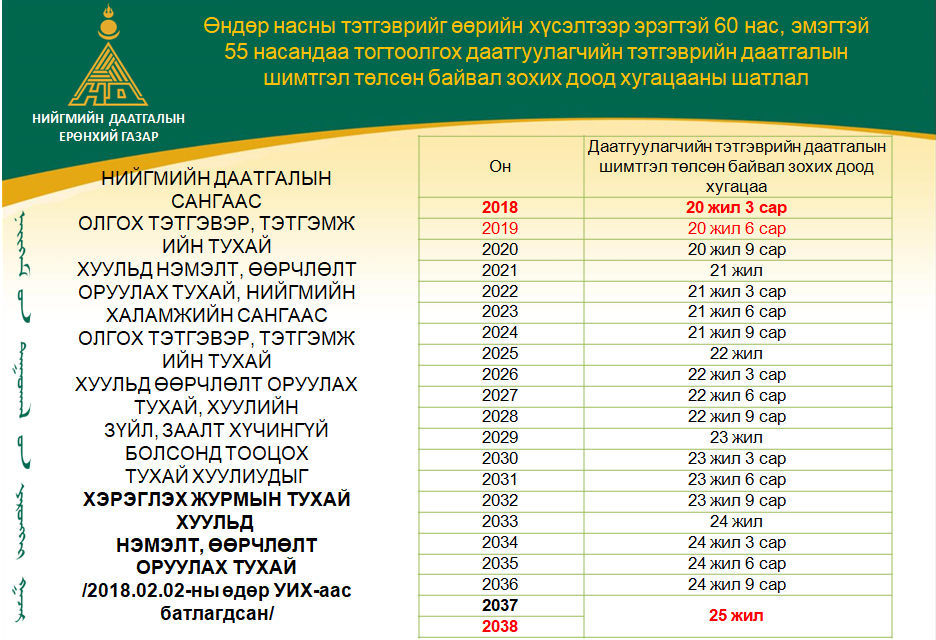 Мөн тэтгэврийг дараалсан таван жилийн буюу 60 сарын дундаж цалингаас тогтоож байгаа. Тэгвэл 2019 оноос зургаан жил буюу 72 сар, 2020 оноос долоон жилийн буюу 84 сарын дундаж цалингаар тогтоохоор өөрчилсөн байна.