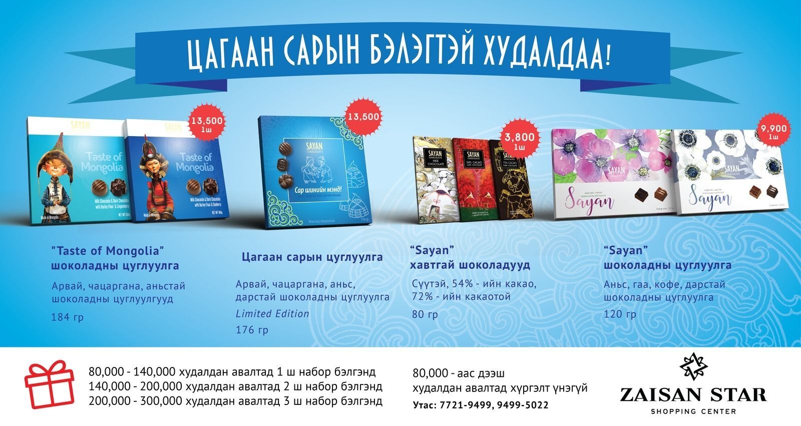 Цагаан сарын баярыг тохиолдуулан бид бүх бараагаа үйлдвэрийн үнээр ZAISAN STAR ХУДАЛДААНЫ ТӨВД борлуулж мөн 80.000₮ төгрөгөөс дээш худалдан авалтад хот дотор үнэгүй хүргэж өгнө. Худалдан авалтын үнийн дүнд нь шоколадны наборны бэлэгтэй!