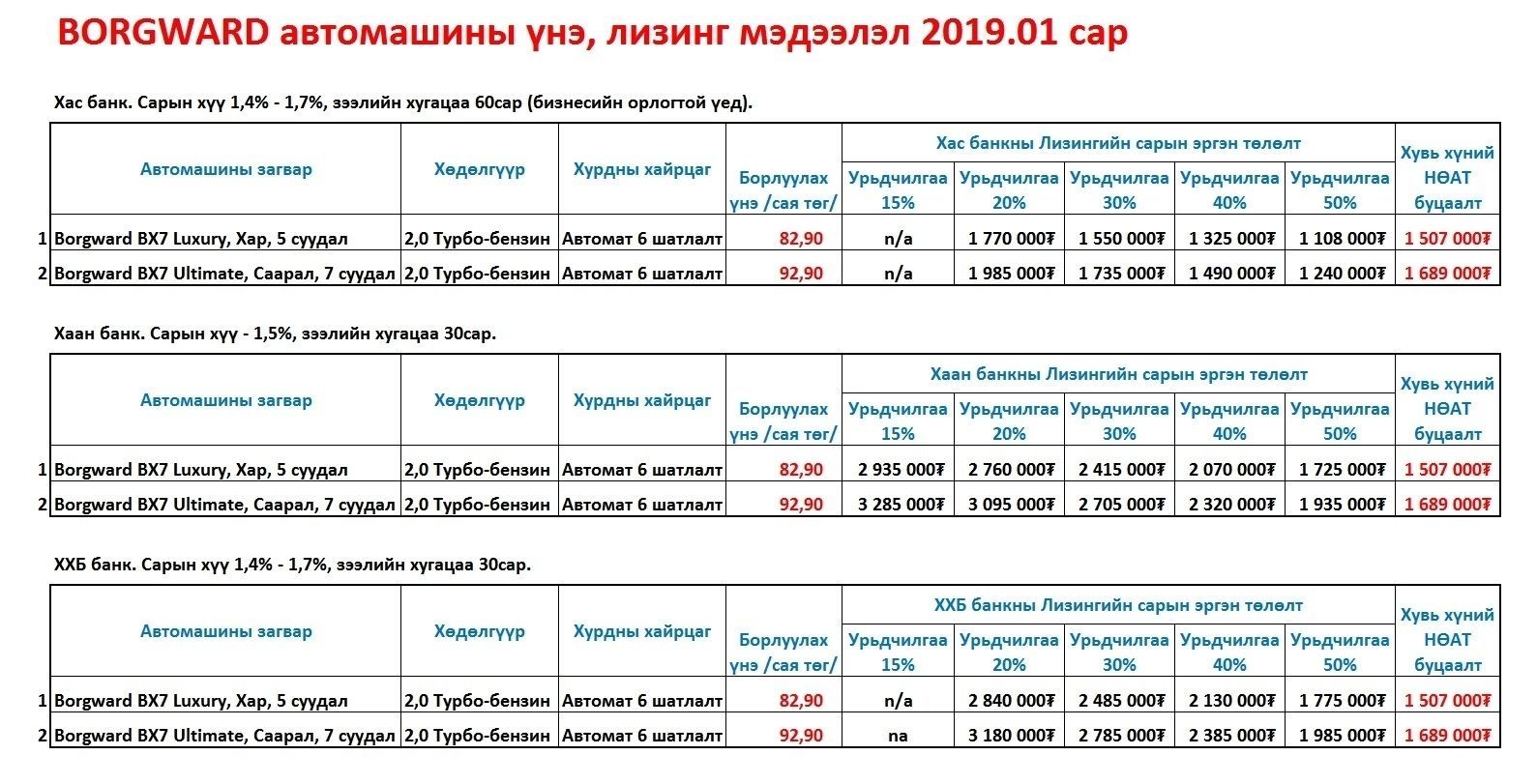 Хас банк , Хаан банк ба ХХБанкны лизингээр авах боломжтой ба хүснэгтийг доор үзүүлэв.