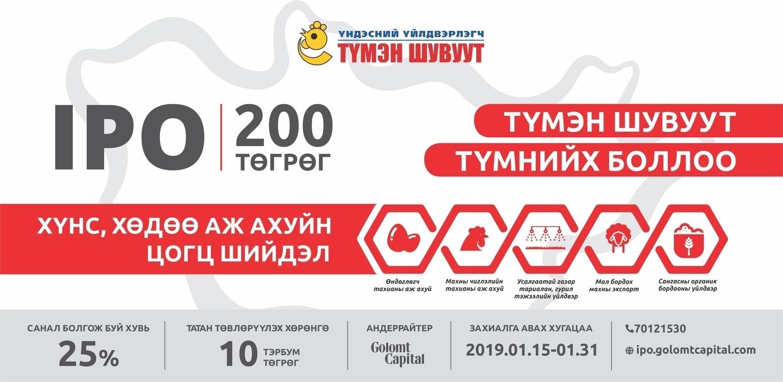 - Түмэн Шувуутын хувьцааны захиалга 2019.01.31 хүртэл үргэлжилнэ. Өөрөөр хэлбэл 3 хоног үлдлээ. Бидний хувьд энэ IPO-д оролцох хүсэлтэй хүн бүрийг хамруулах зорилт тавьж байгаа учраас та энэ хугацаанд амжиж дансаа нээлгэж, захиалгаа өгч болно. Тиймээс та өөрөө тэгж байгаад гэж хойш тавьж, хугацаа алдалгүйгээр дансаа нээлгэж, захиалгаа өгөхөд л болно.
