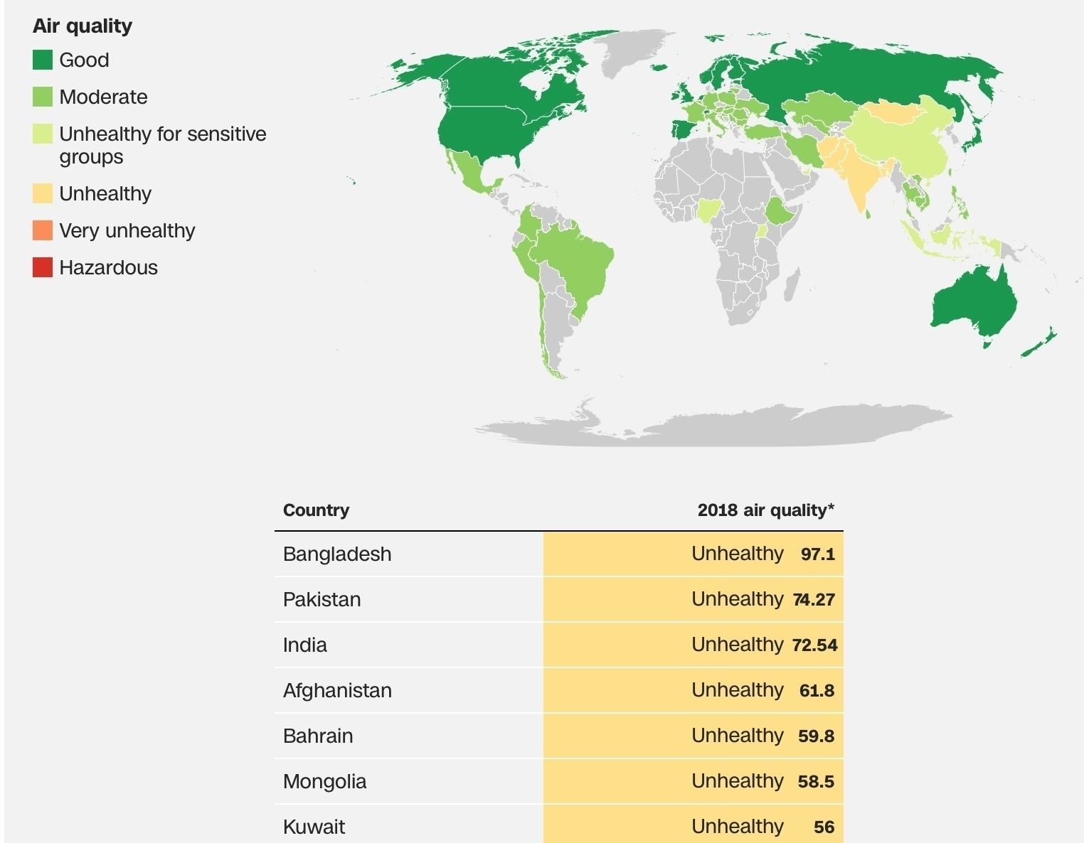 AirVisual сайт 2018 онд дэлхийн хотуудын агаарын бохирдол ямар түвшинд байсныг судлан тогтоожээ. Ингэхдээ нийт 3,000 хотын агаар дахь PM2.5 тоосонцрын хэмжээг жилийн турш хэмжиж үнэлсэн байна.
