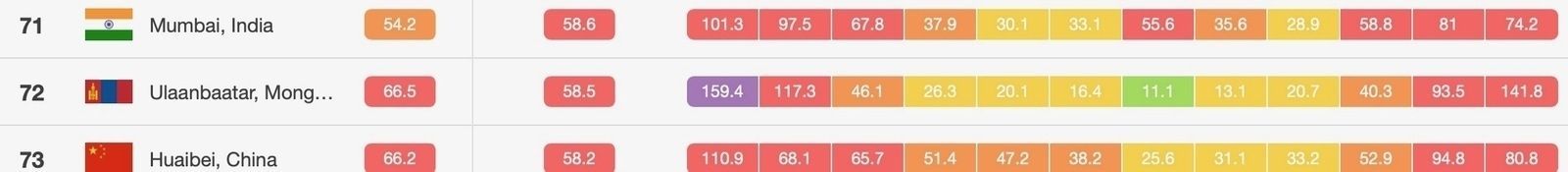 Харин хамгийн их агаарын бохирдолтой хотуудын жагсаалтад Улаанбаатар хот 72 дугаарт жагссан байна.