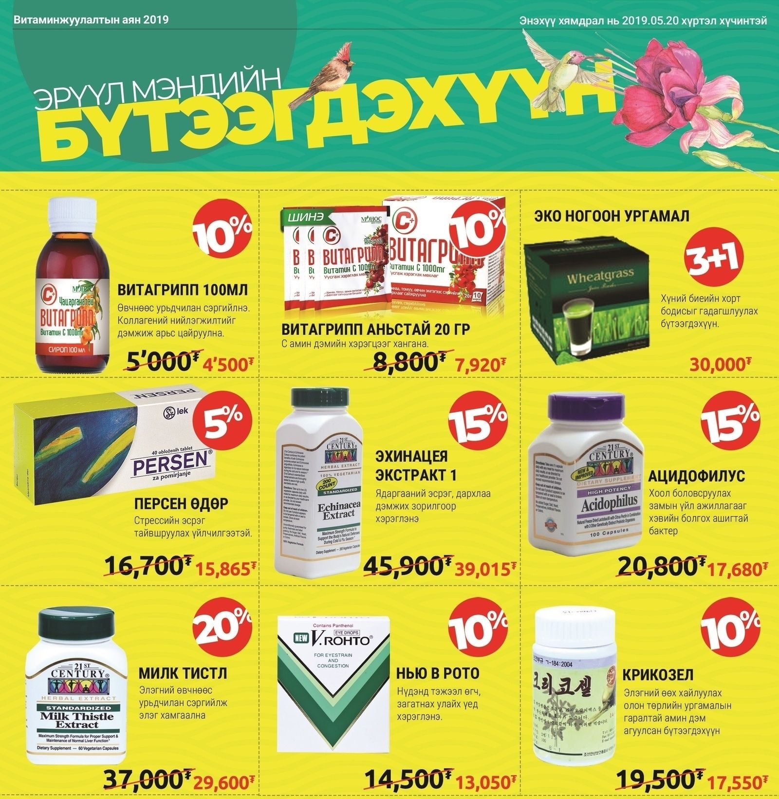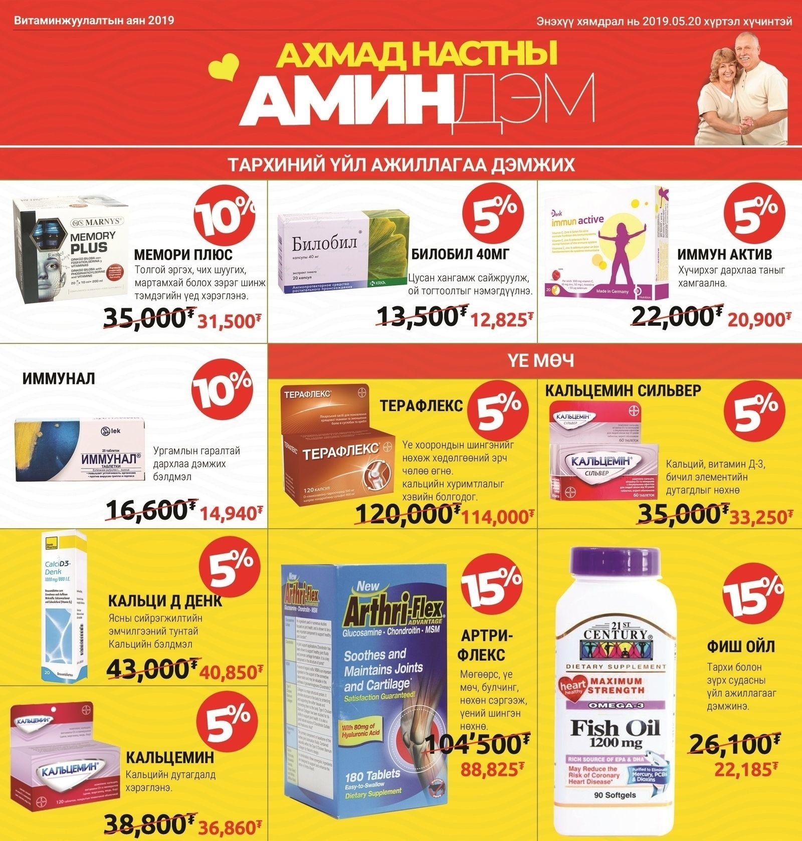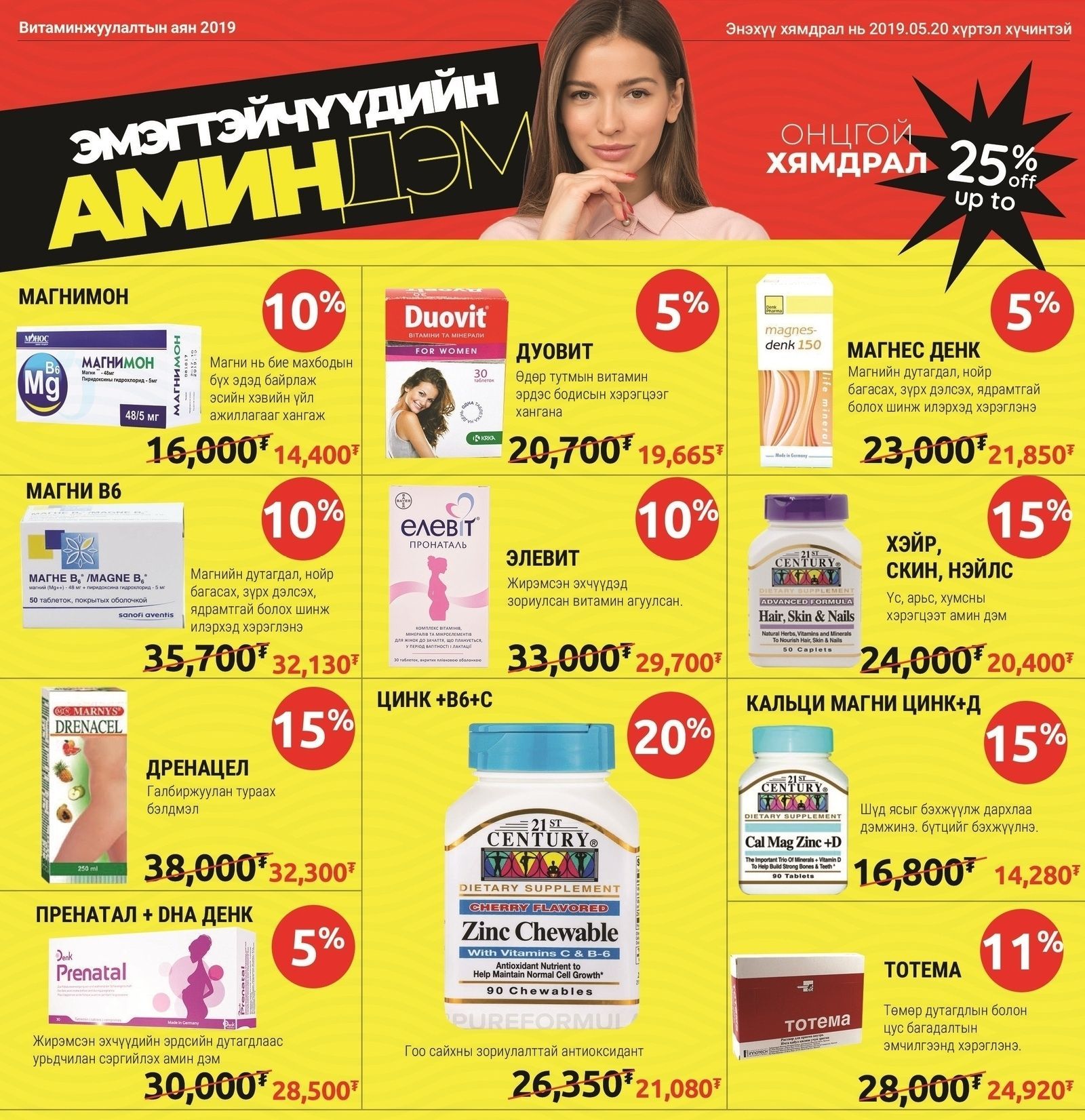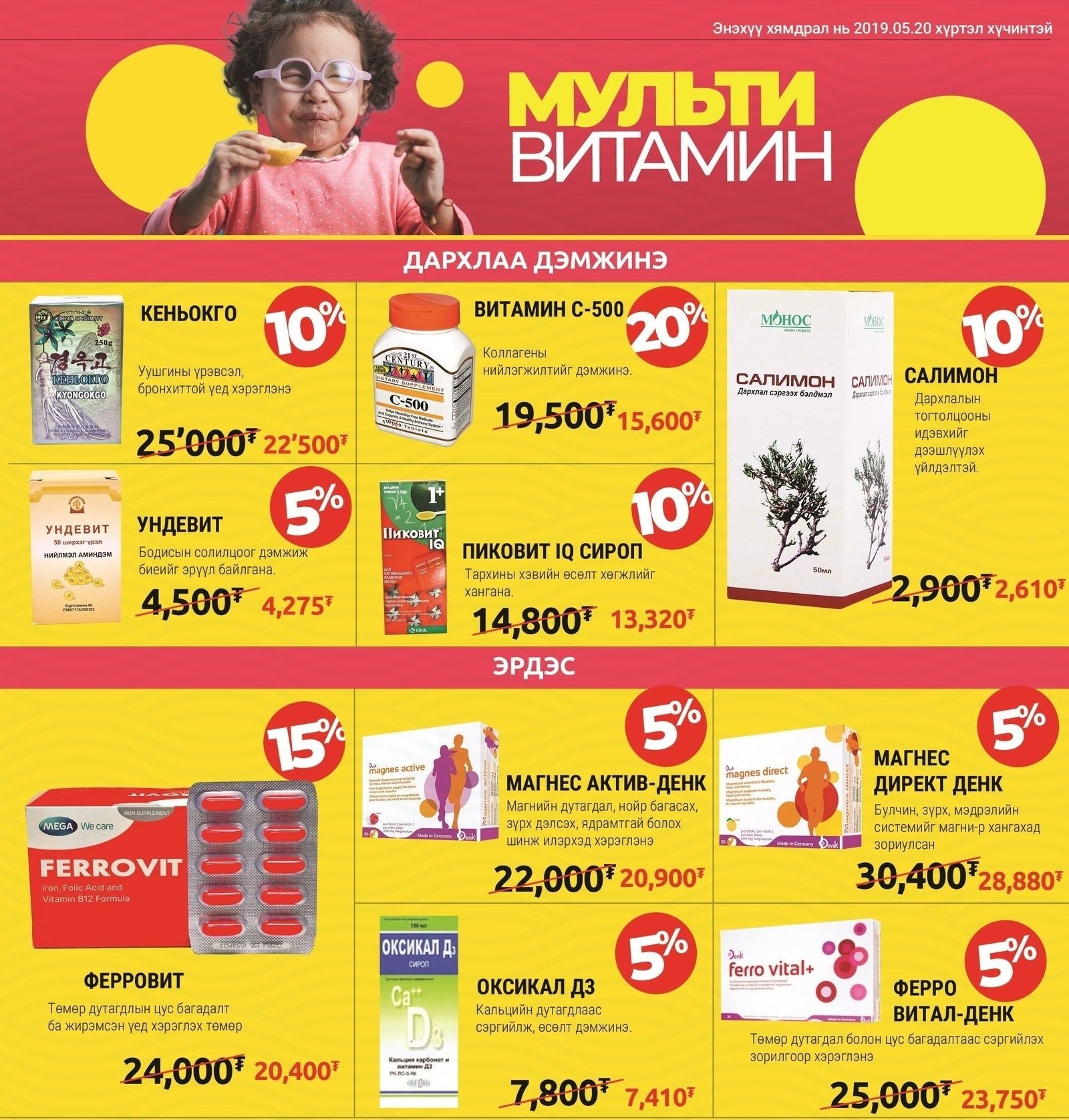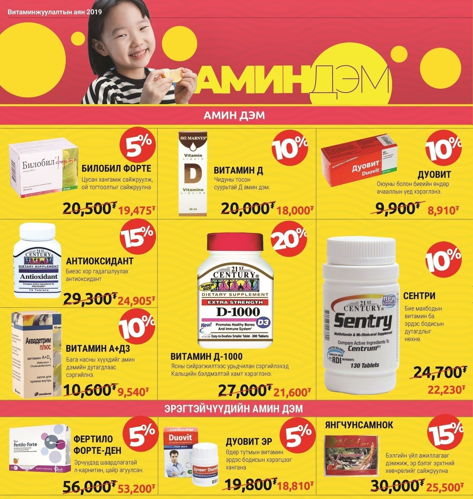 Витаминжуулалтын аянд Хүүхэд, Эрэгтэйчүүд, Ахмадууд, Жирэмсэн эмэгтэйчүүдэд зориулсан 400 нэр төрлийн амин дэмийг 5-25% хямдруулж авах боломжтойгоос гадна Монос гишүүнчлэлийн картын хэрэглэгчиддээ зориулан 14 хоног бүр онцгойлсон бүтээгдэхүүнийг худалдан авбал БОНУС ОНООГ 2X ДАХИН үржих урамшууллыг аяныхаа хүрээнд зохион байгуулж байна.