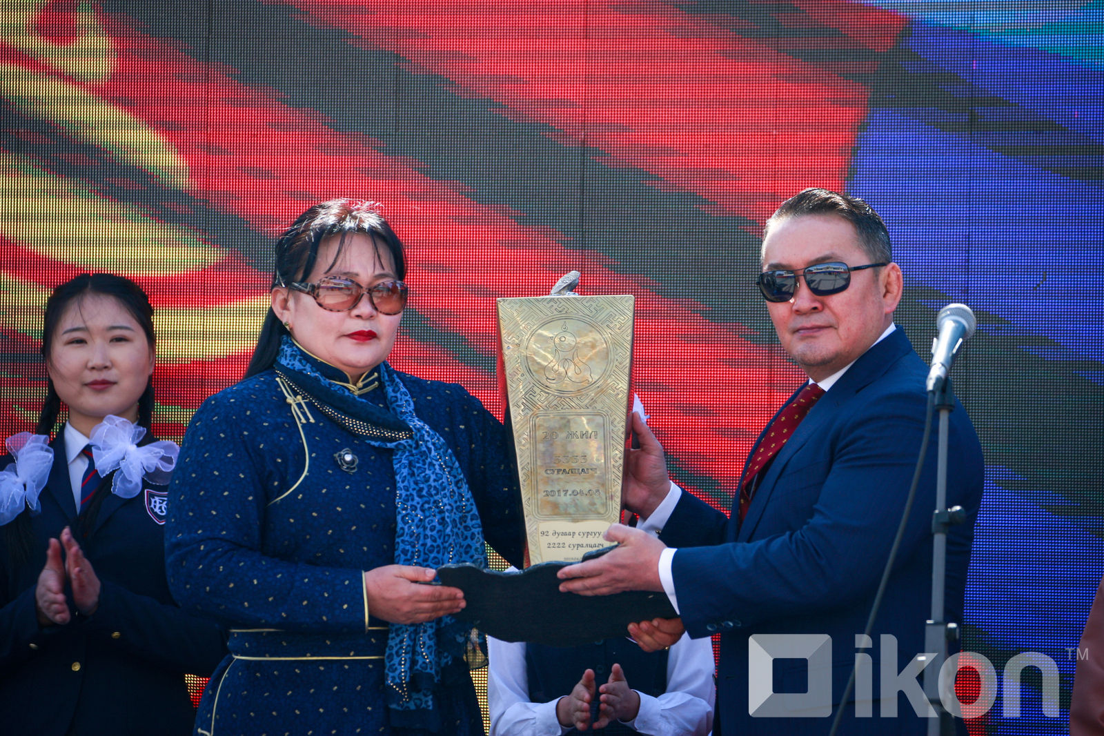 Монгол Улсын Ерөнхийлөгч Х.Баттулга үг хэлснийхээ дараа шилжин явах цомыг Нийслэлийн Сонгинохайрхан дүүргийн 122-р сургуулийн хамт олонд гардуулж өгөв.