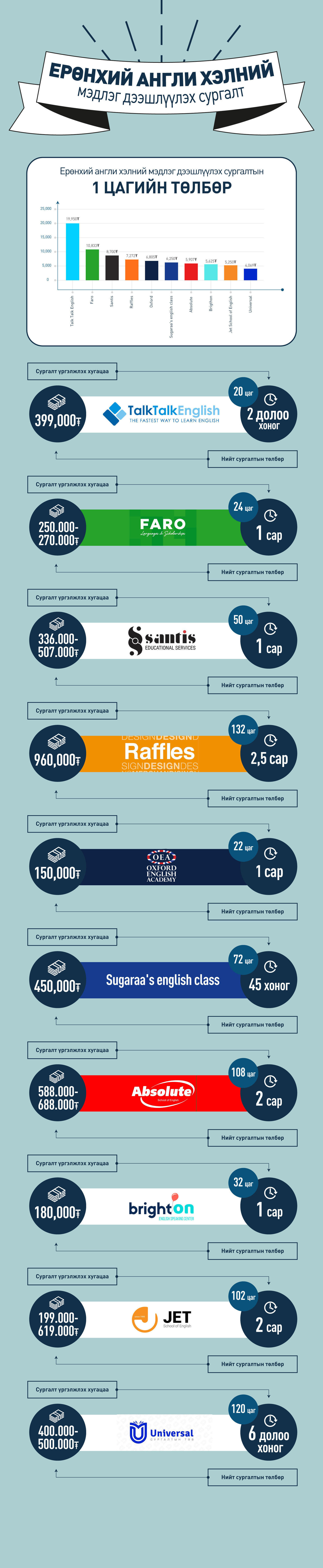 Энэ удаагийн дугаараар та бүхэндээ насанд хүрэгчдэд зориулсан англи хэлний мэдлэг дээшлүүлэх сургалтыг явуулдаг томоохон 10 төвийн харьцуулсан судалгааг хүргэж байна. Судалгаанд сургалтын төлбөр, хөтөлбөрийн дагуу суралцагчид зарцуулах нийт цагийн мэдээлэл, сургалтын үргэлжлэх хугацааг танилцуулна. Мөн 1 цагт оногдох мөнгөн дүнг нарийвчлан харуулсан тул таны шийдвэр гаргалтанд чухал нөлөө үзүүлэх болно гэдэгт итгэлтэй байна.