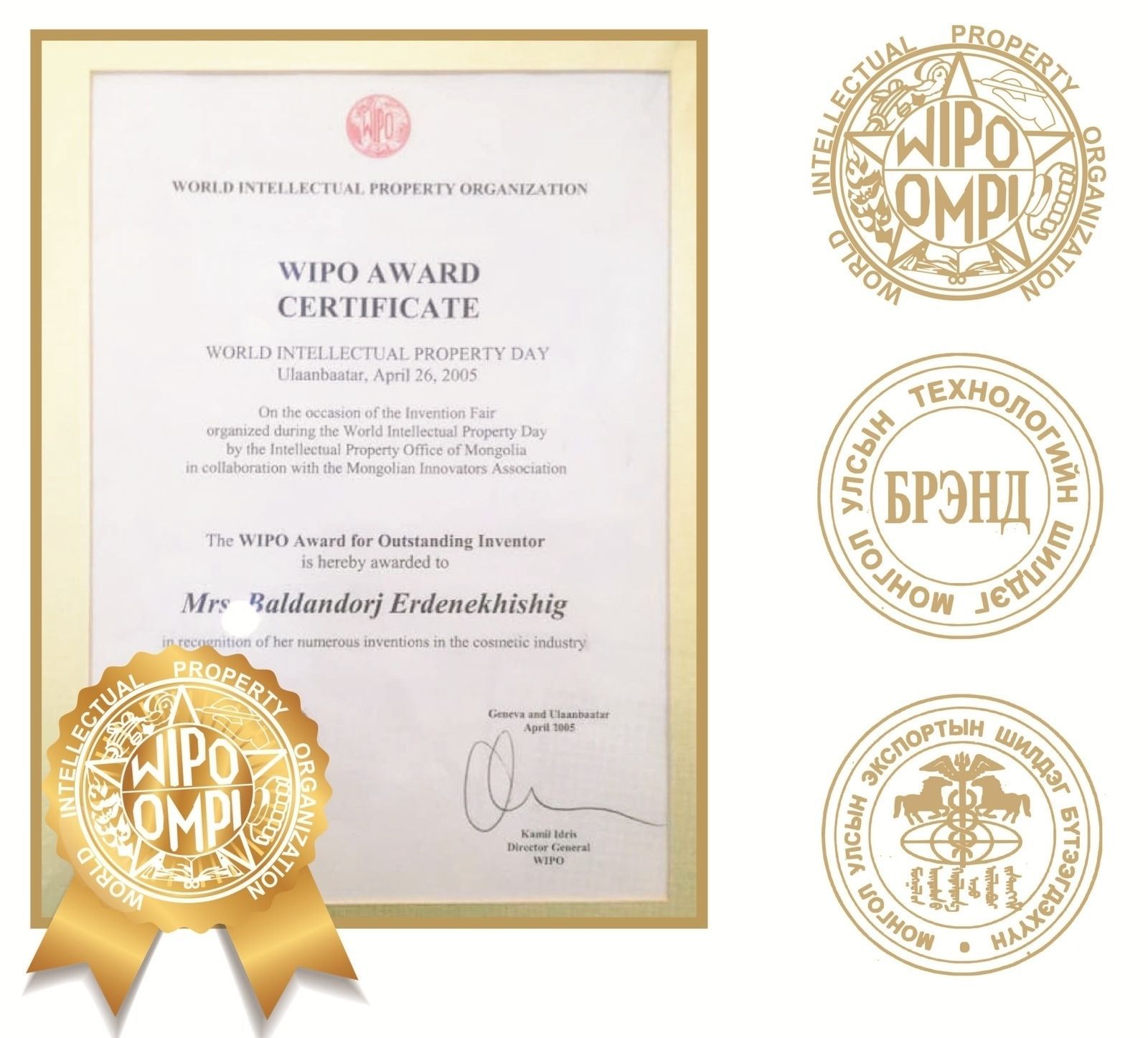 Дашрамд сонирхуулахад, Монгол Улс Дэлхийн оюуны өмчийн байгууллагад гишүүнээр элссэний 40 жилийн ойн арга хэмжээ өнөөдөр зохион байгуулагдана. Ойн арга хэмжээний үеэр Дэлхийн оюуны өмчийн байгууллагын “Алтан медаль” хүртсэн зохион бүтээгчдийг алдаршуулах зорилготой “Дэлхий үнэлсэн монгол брэнд” үзэсгэлэн, арга хэмжээ 2019 оны 4 дүгээр сарын 22-25-ны өдрүүдэд зохион байгуулагдах аж.