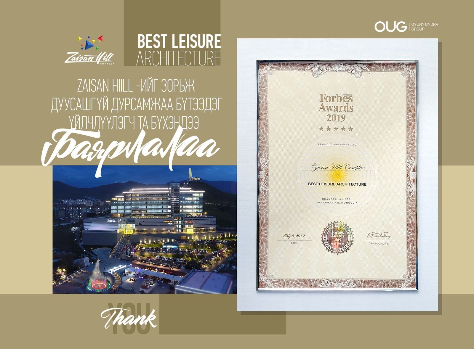 Монгол Улсын бизнесийн ертөнцөд тэргүүлж,амжилтаа бататгаж байгаа шилдэг компаниудаас шилдэгийг шалгаруулах зорилготой “Forbes Mongolia Awards 2019” ёслолын арга хэмжээгээр Амралтын шилдэг цогцолбороор Оюуны Ундраа Группийн Зайсан Хилл цогцолбор шалгарлаа.