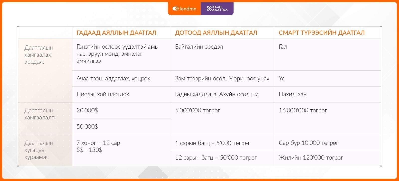 Хэрвээ та LendMN аппликейшныг хэрэглэдэг л бол нэмэлт үйлчилгээ цэс дэх Даатгал товч дээр дарснаар Хаан Даатгал компаниас санал болгож буй дараах 3 төрлийн даатгалын үйлчилгээг бичиг баримт бүрдүүлэхгүй, шуурхай найдвартай авах боломжтой.