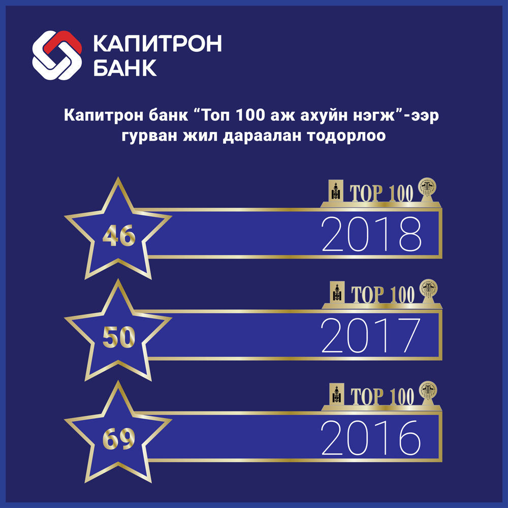 Энэ бүх амжилт нь эрхэм хүндэт харилцагч, үйлчлүүлэгч та бүхний итгэлийн үнэ цэнэ, хамтын ажиллагааны салшгүй хэсэг бөгөөд Монгол Улсын “Топ-100” аж ахуйн нэгжийн нэг Капитрон банкны харилцагч, хамтран ажиллагч та бүхэнд талархал илэрхийлж, сан хөмрөг тань өдрөөс өдөрт өсөн нэмэгдэхийн өлзийтэй ерөөлийг өргөн дэвшүүлье!