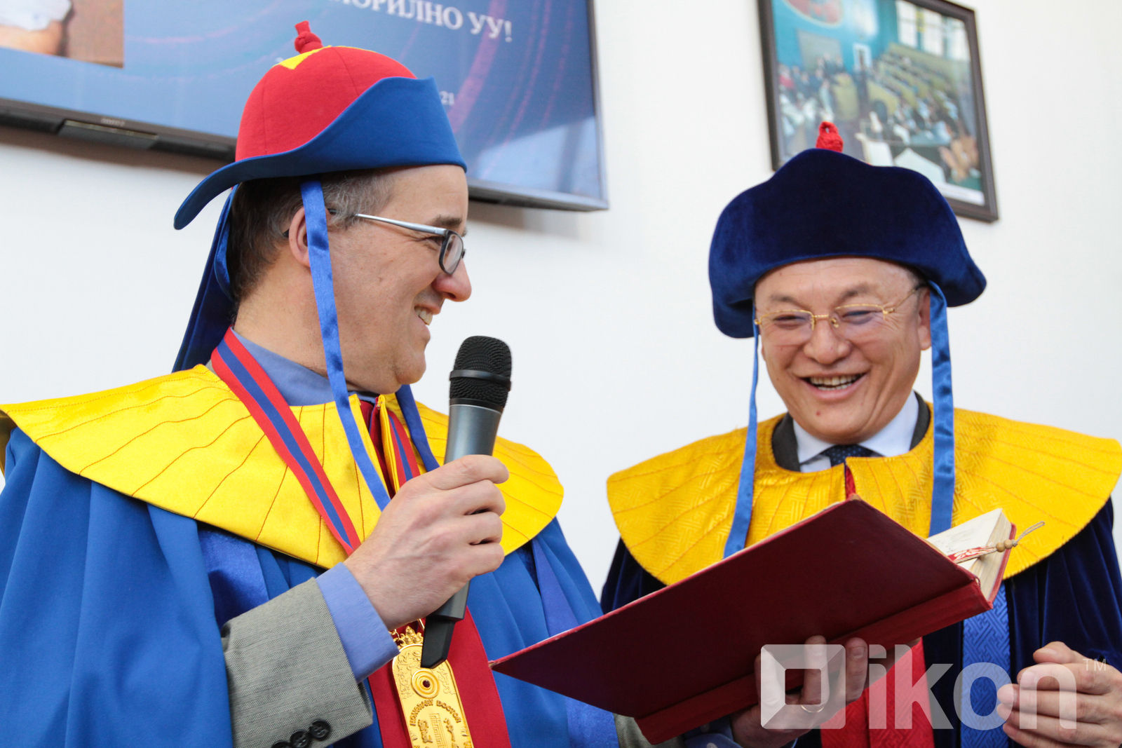 МУИС-ийн "Хүндэт доктор" цол хүртсэн тэрбээр "Надад МУИС-ийн "Хүндэт доктор" цол олгосонд гүн талархал илэрхийлж байна. Би 1989 онд анх энэ эрдмийн танхимд орж ирж байсан. Тэр үед энэ сүр жавхлант түүхтэй сургуулийн "Хүндэт доктор" болно, ингэж шагнагдана гэж ерөөсөө бодоогүй. Тухайн үед хуучирч муудсан байсан танхим сайхан засвар хийж, монгол гэр шиг болсон байгаад баяртай байна.