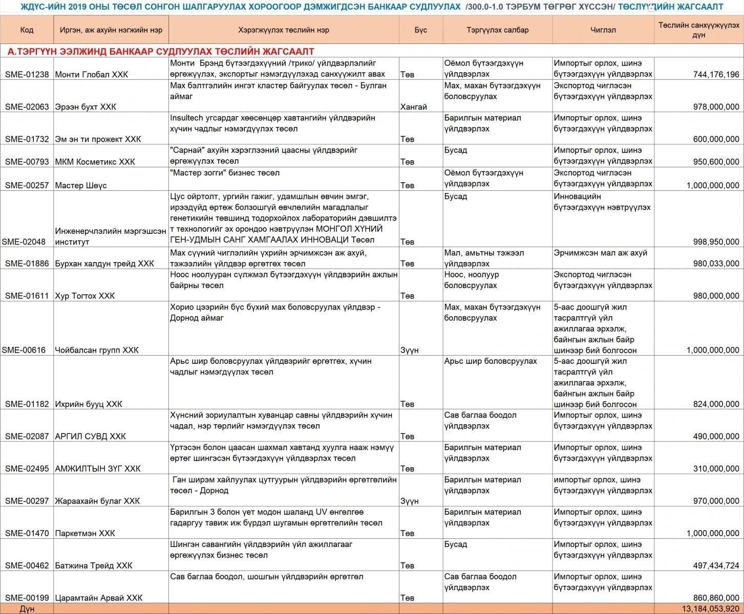 ЖДҮХС-аас урт, хугацаатай хөнгөлөлттэй зээл олгох, төсөл сонгон шалгаруулах үйл ажиллааны үр дүнд эхний ээлжинд банкаар дамжуулан санхүүжигдэх, Засгийн газраас баталсан жижиг, дунд үйлдвэрийн тэргүүлэх ач холбогдол бүхий салбар, чиглэлд нийцсэн нийт 16 аж ахуйн нэгжийн 13.2 тэрбум төгрөгийн төсөл шалгуур хангаж, хөнгөлөлттэй зээлд хамрагдах боломжтой боллоо.