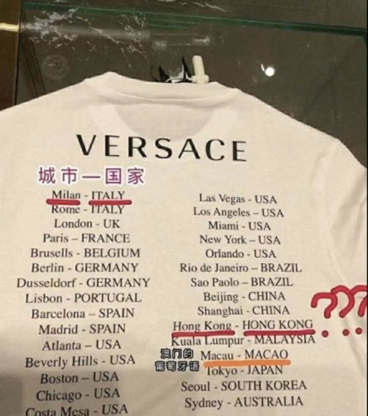 Версачегийн цамцан дээрх бичигт Хонг Конг, Макаог Хятад улсын харьяа газар биш, бие даасан улс мэтээр дүрсэлсэн байжээ.