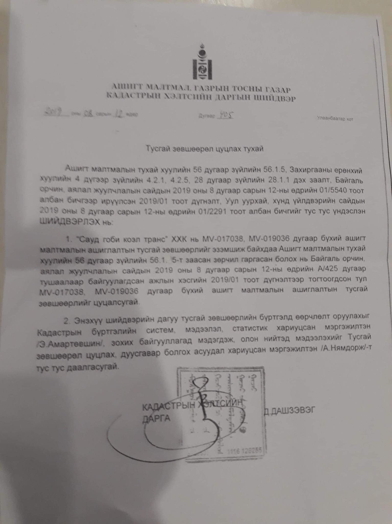 Тэрбээр өнөөдөр Ерөнхий сайдын өгсөн зарим үүрэг даалгавартай холбоотойгоор Тост, Тосон бумбын ордод үйл ажиллагаа явуулж буй Сауд гоби коэл транс ХХК-ийн тусгай зөвшөөрлийг цуцалсан тухайгаа зарлав.