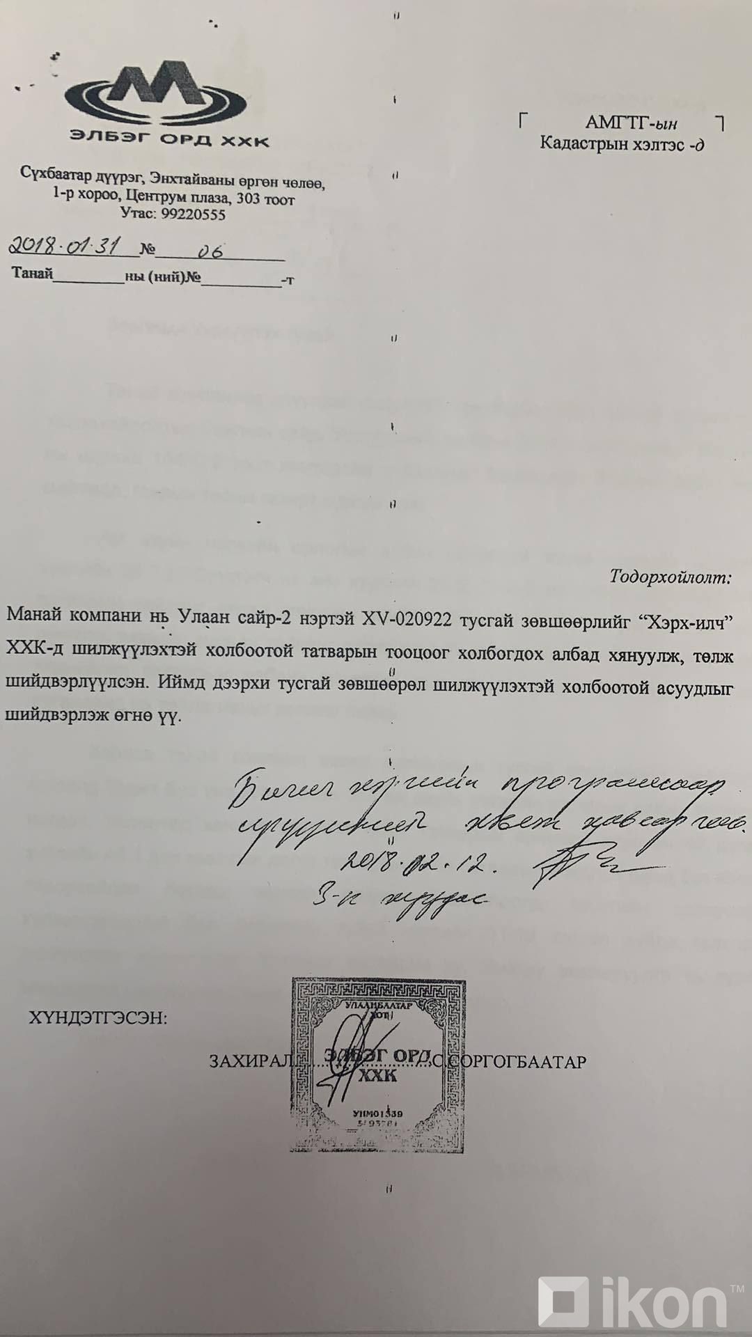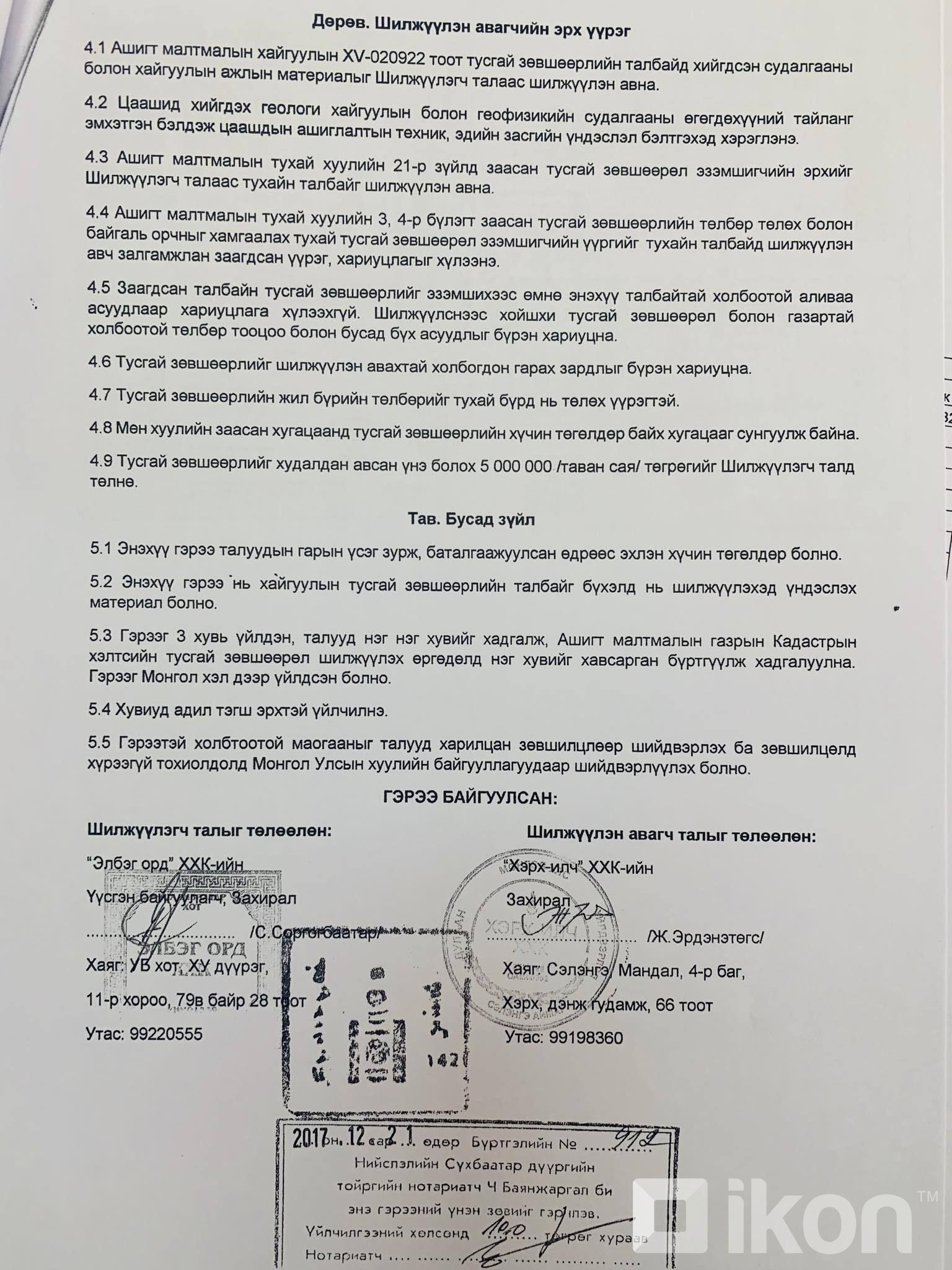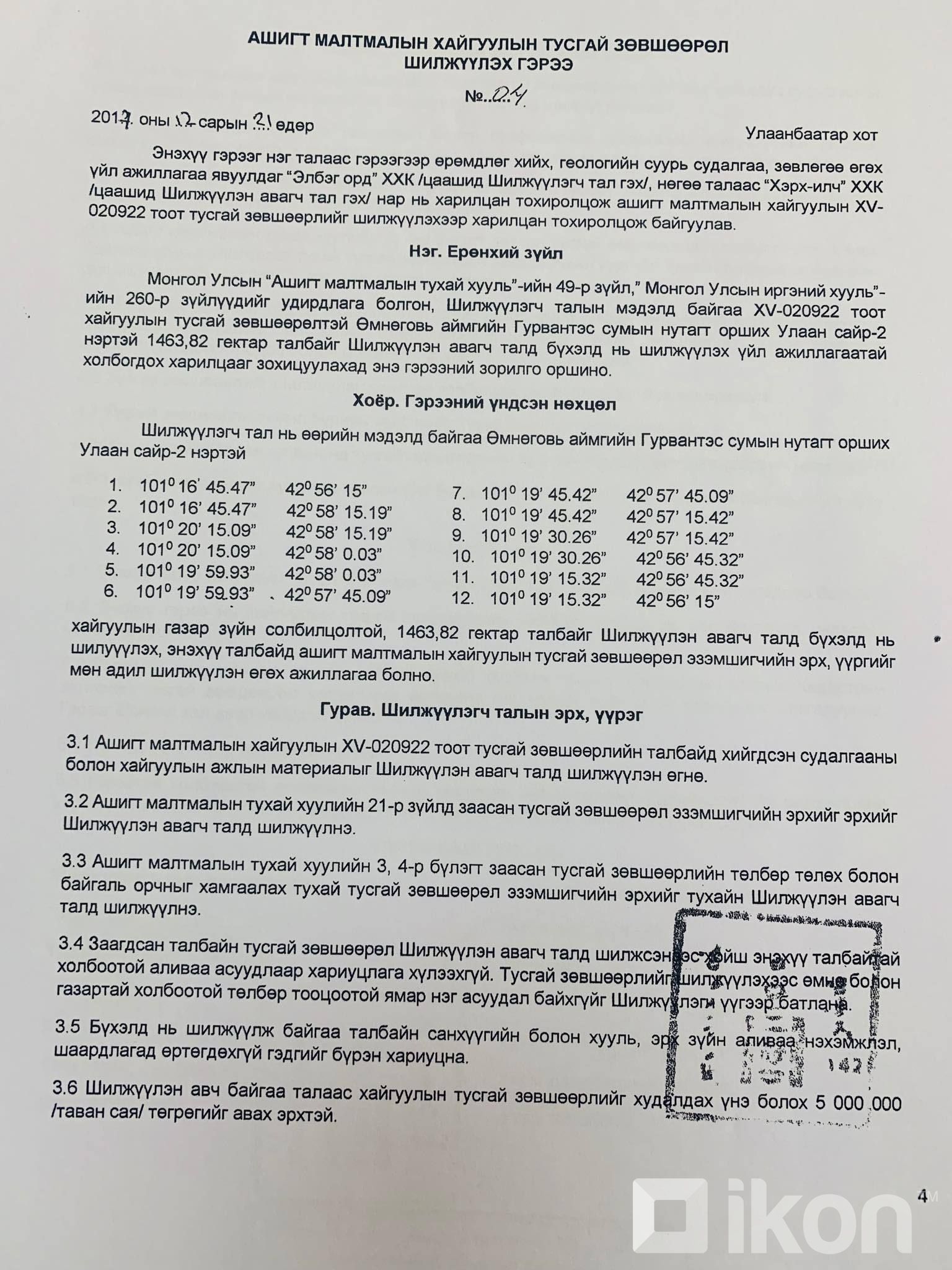 БАРИМТ 4. "Элбэг Орд" ХХК нь "Хэрх Илч" компанид тусгай зөвшөөрлөө шилжүүлэх гэрээ хийж ердөө таван сая төгрөгөөр заржээ.