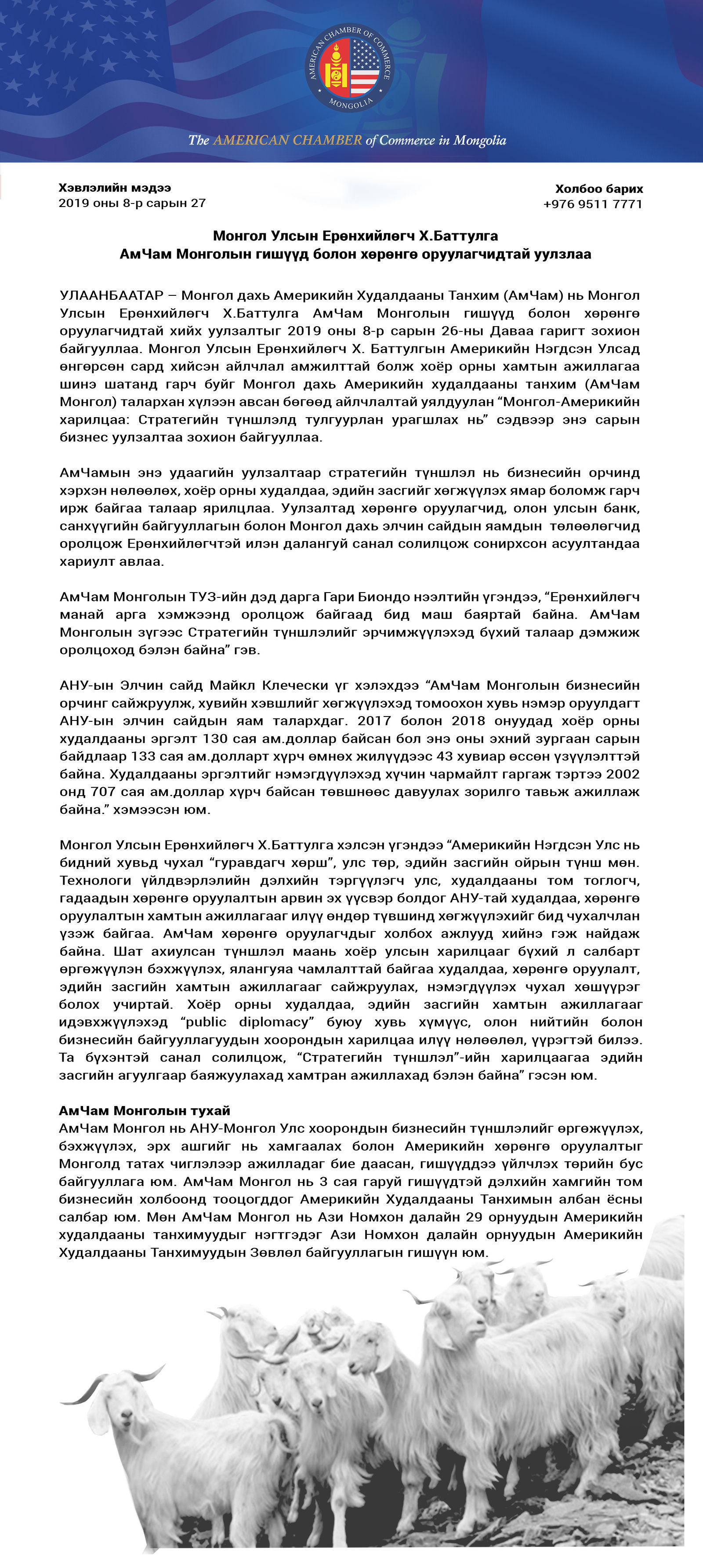Монгол Улсын Ерөнхийлөгч Х.Баттулга АмЧам Монголын гишүүд болон хөрөнгө оруулагчидтай уулзлаа