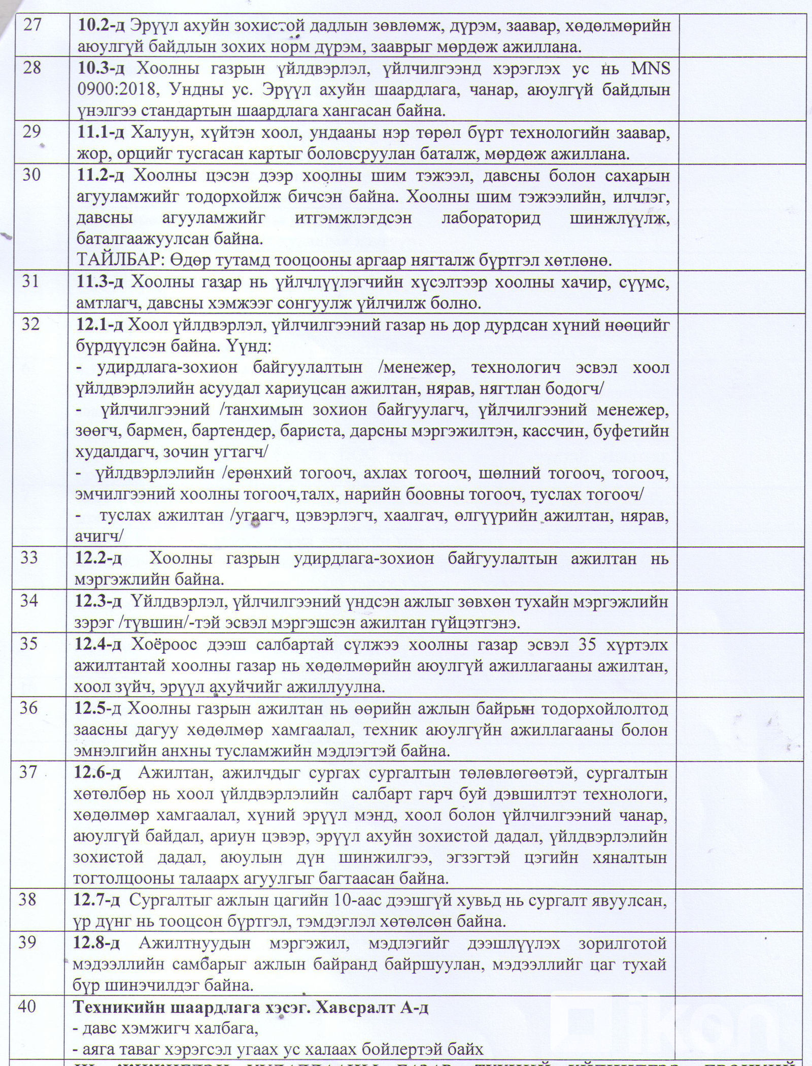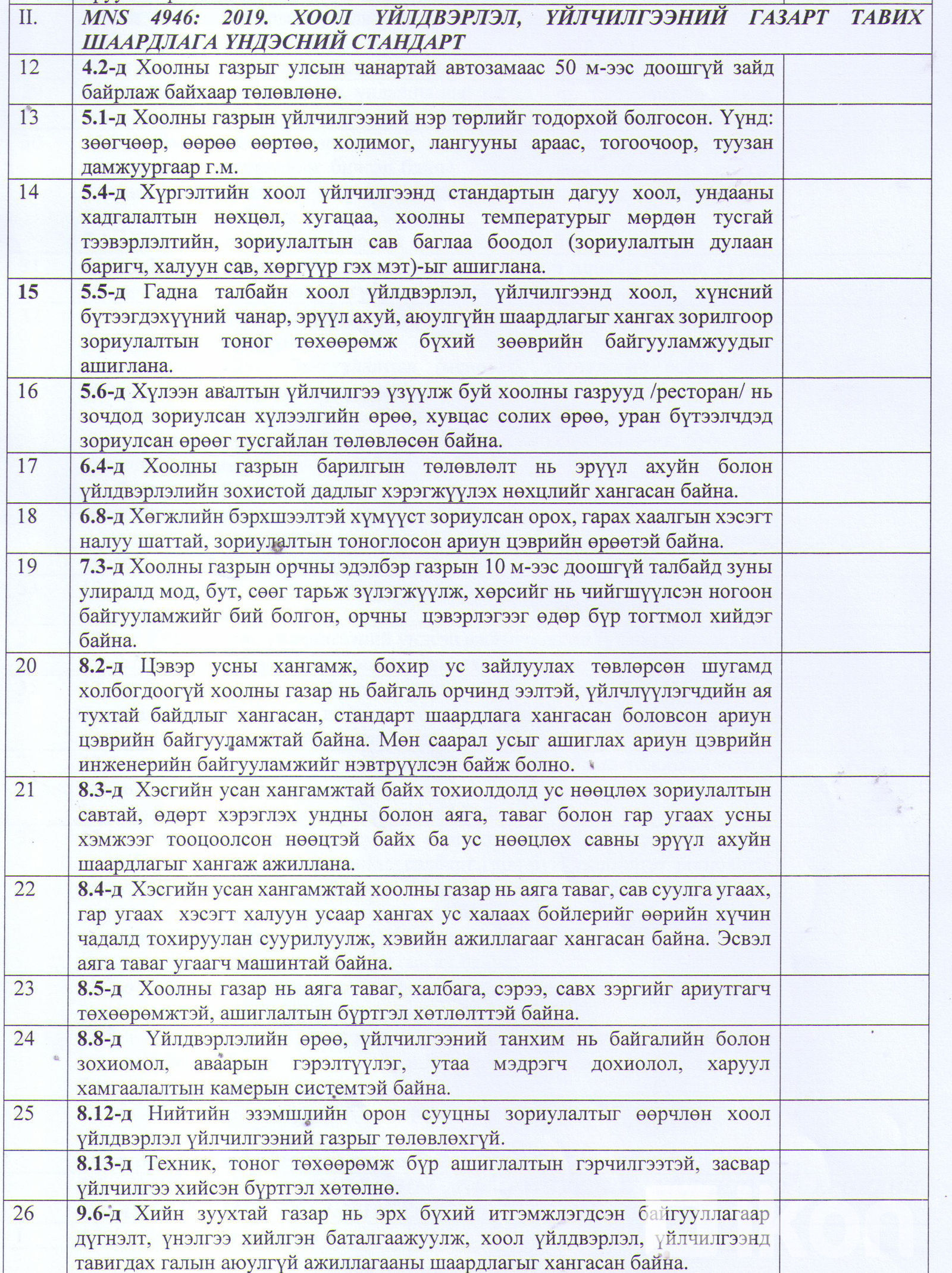 Монголын хоол үйлдвэрлэл, үйлчилгээний мэргэжлийн боловсролын академийн Ерөнхийлөгч Ш.Эрдэнэхүү шинэчлэгдсэн журмын талаар "Чанар, аюулгүй байдлыг хэрэгжүүлэх түлхүүр нь стандарт. Тэрхүү стандарт 2005 онд батлагдаж байснаас хойш 14 жилийн дараа шинэчлэгдэж байна. Стандартыг хоёр жил гаруйн хугацаанд судалгаа, шинжилгээ хийж боловсрууллаа. Үүнээс хүний нөөцийг онцолмоор байна.