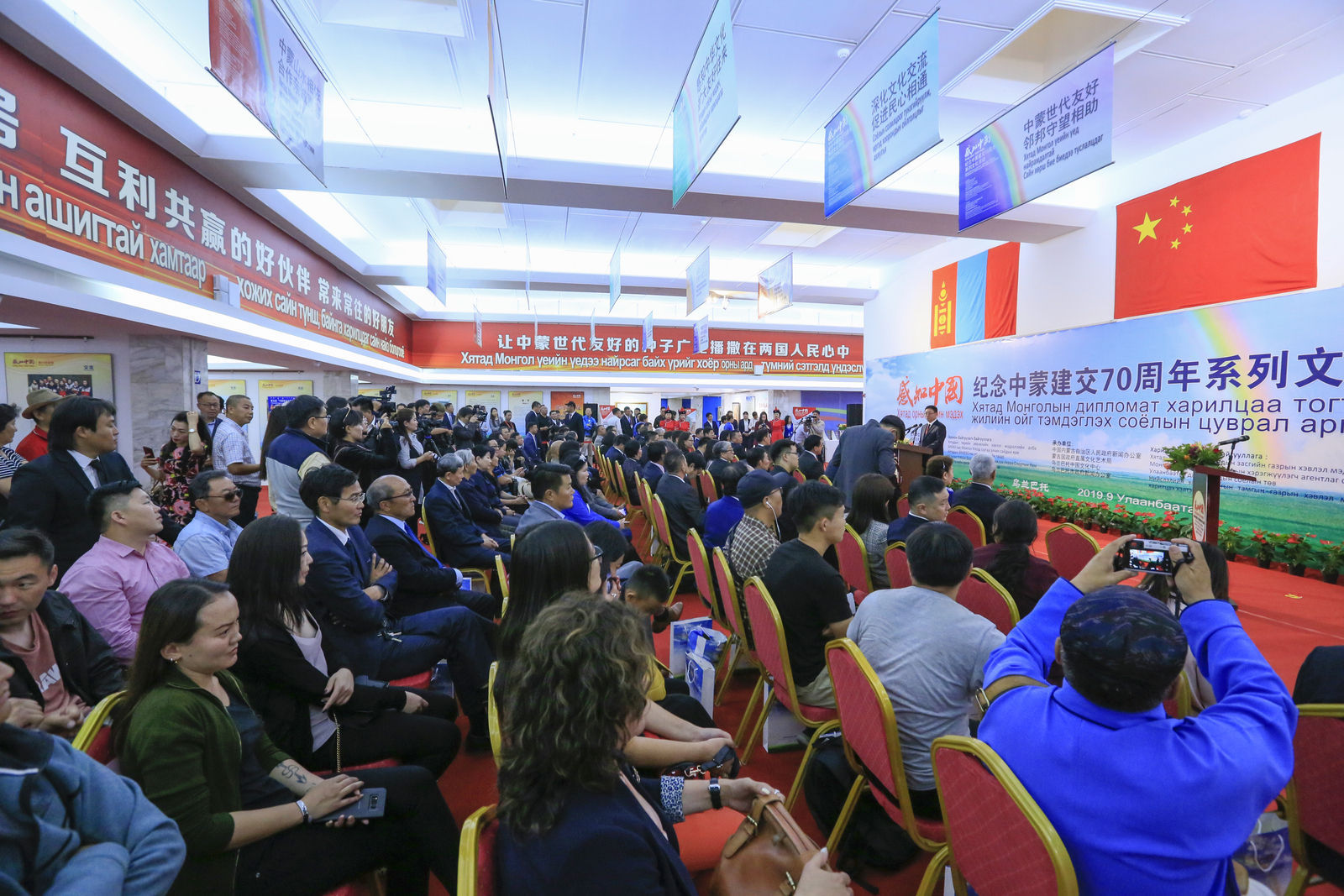Үзэсгэлэнд “БНХАУ-ын 70 жил”, “Манай найрамдал”, “Түмэн газрын цайны зам” гэрэл зургийн үзэсгэлэн, “Хятадын хатгамлын урлагийн бүтээлийн үзэсгэлэн”, “Монгол морины урлагийн бүтээлийн үзэсгэлэн” уран зургийн үзэсгэлэн гэсэн таван хэсгээс бүрдсэн нийт 150 гаруй үзмэр дэлгэгджээ.