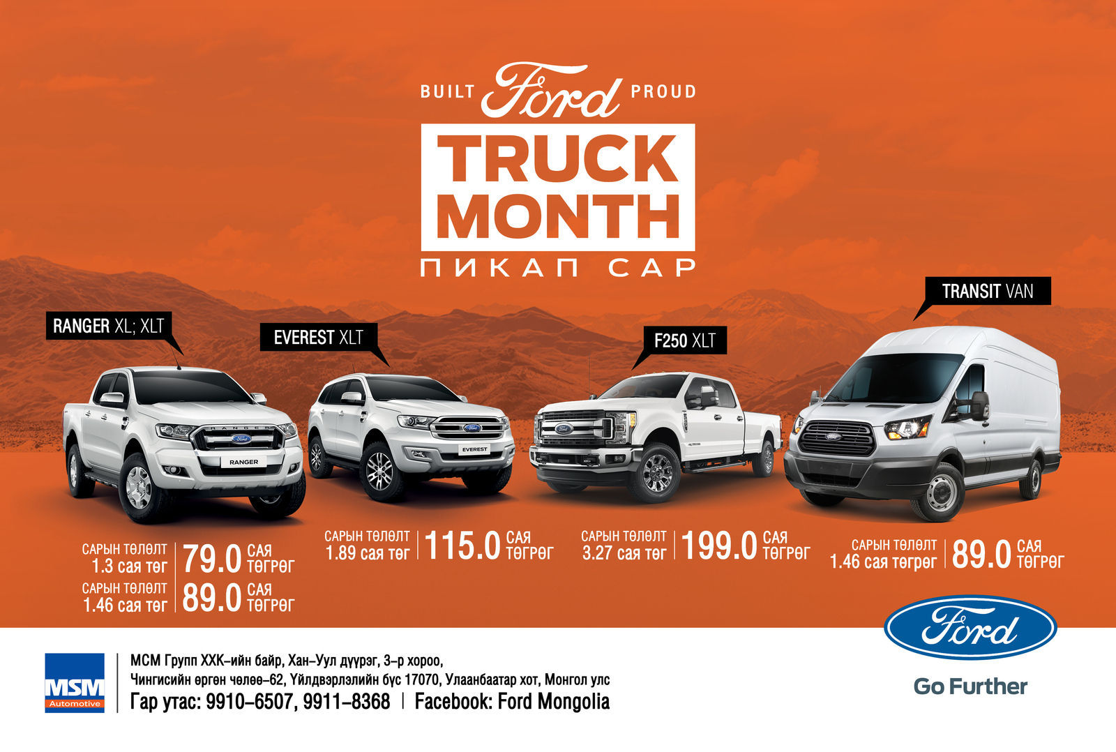 Танд Ford Everest, F-250, Ranger XL, XLT болон Transit Van автомашинуудыг жилийн хамгийн боломжит үнэ, төлбөрийн уян хатан нөхцөлтэйгөөр санал болгох “Пикап сар” аян үргэлжилж байна.