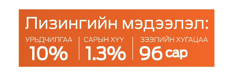 Урамшуулалт аяны хүрээнд шинэ автомашин худалдаж авахыг зориж буй хэрэглэгч танд 10% урьдчилгаа төлөөд банкны хамгийн бага буюу сарын 1,3%-ийн хүүтэйгээр, 96 сарын хугацаатайгаар Ford автомашинуудыг худалдан авах нөхцөлийг бид санал болгож байна.