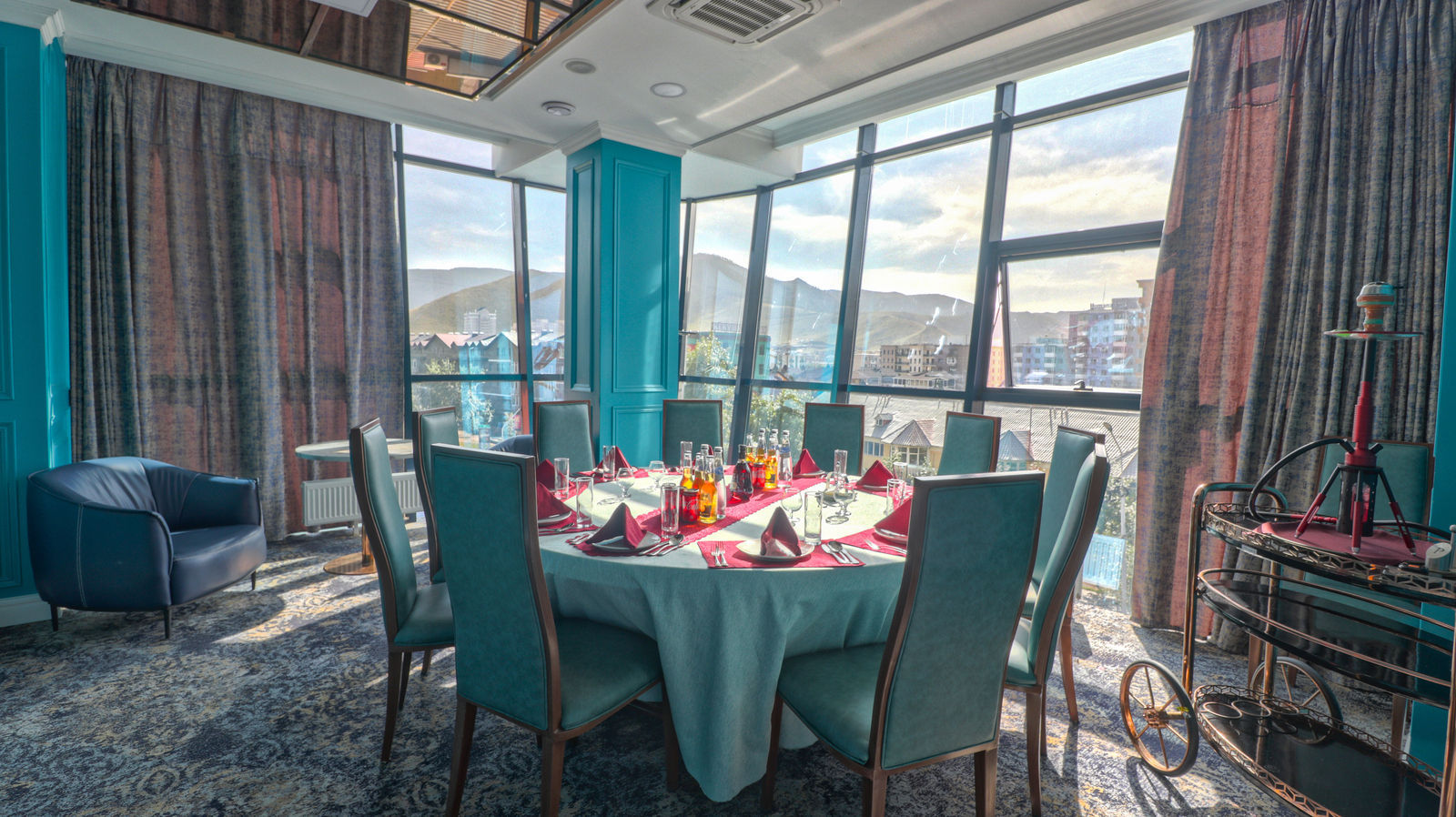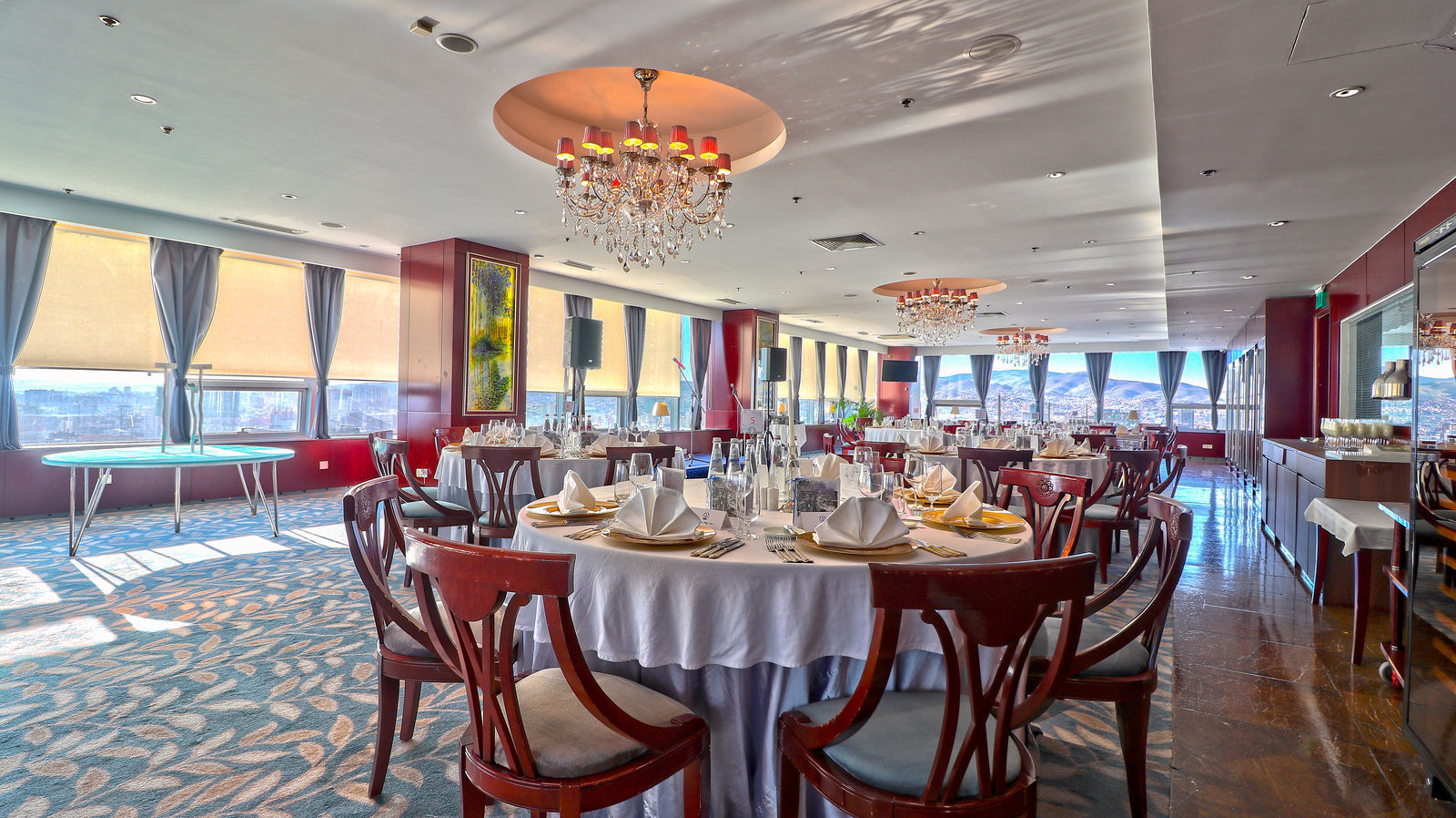 Классик орчин энд ноёлно. Рестораны цонхоор нийслэл хотоо яг алган дээр тавьсан юм шиг бүхэлд нь харах боломжтой.