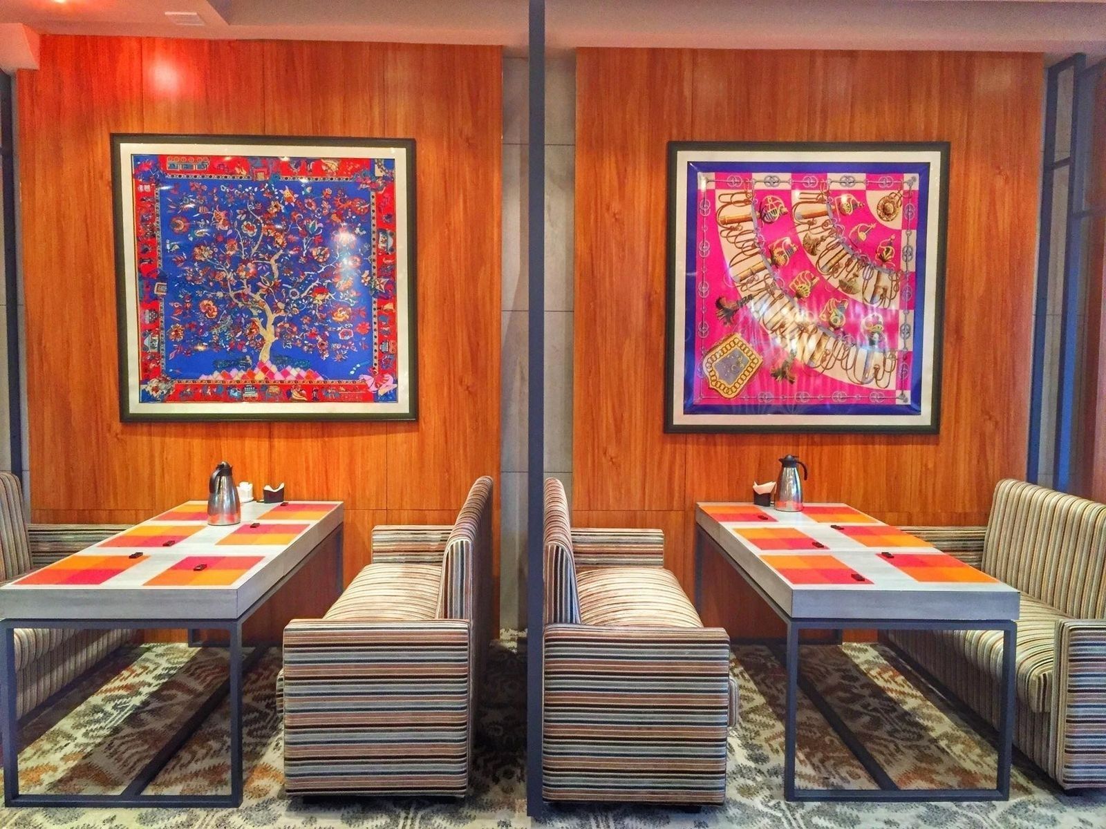 Дорнын хэв маяг бүхий заал. Орчин нь цэлгэр, саруулхан, сэрүүхэн, тухтай. "Hermes" брэндийн хээ хуар бүхий гоёмсог алчуурыг ханандаа өлгөсөн нь хэний ч нүдэнд тусна. Яг л уран зураг шиг. Бас хивснийх нь хээ хараа булаана. Орчин үеийн тренд бүхий энэхүү хивсийг "Эрдэнэт"-ээс сонгожээ.