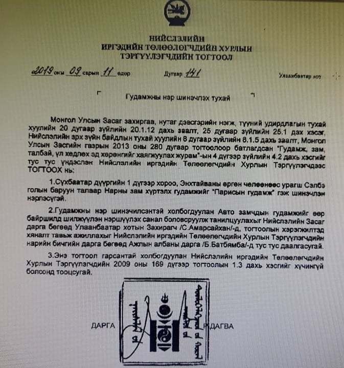 Нийслэлийн Иргэдийн Төлөөлөгчдийн хурлын Тэргүүлэгчдийн 2019 оны 141 дүгээр тогтоолоор гудамжны нэрийг өөрчилсөн байна.