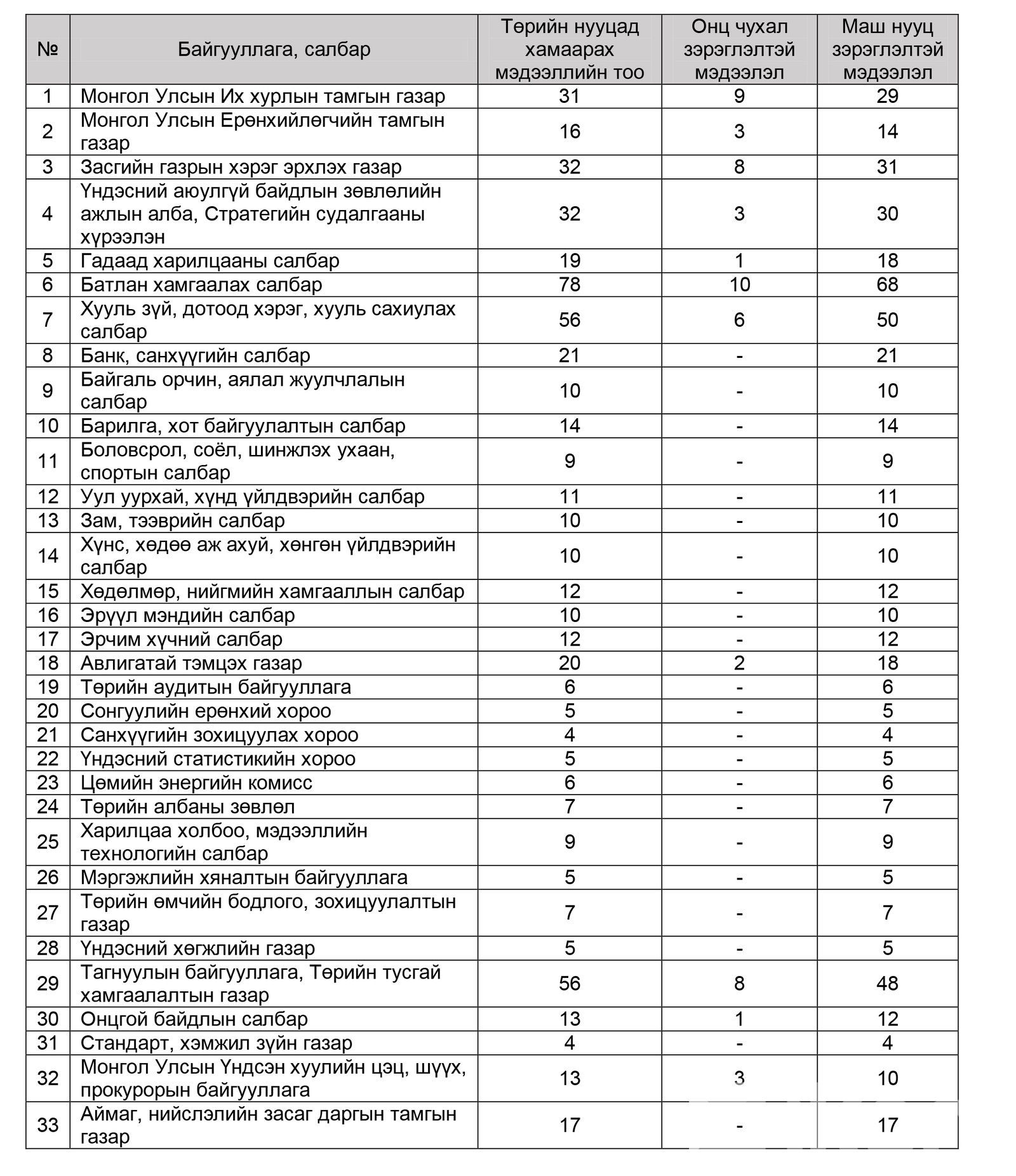 Хүснэгт 2. 2017 оны есдүгээр сарын 1-нээс үйлчилж эхэлсэн Төрийн болон албаны нууцын тухай хуулиар Засгийн газар төрийн нууцын жагсаалт батлах эрхтэй болсноос хойших төрийн нууцын жагсаалт.