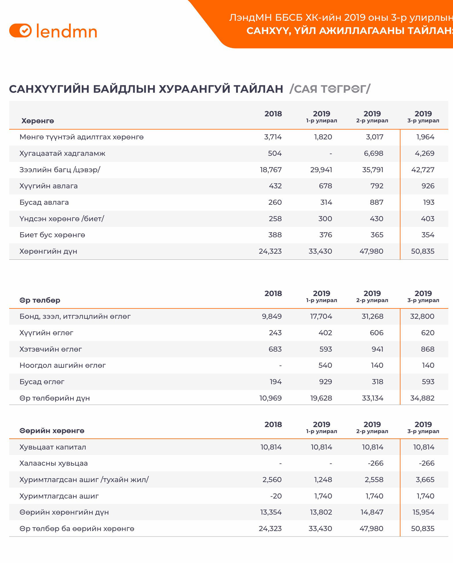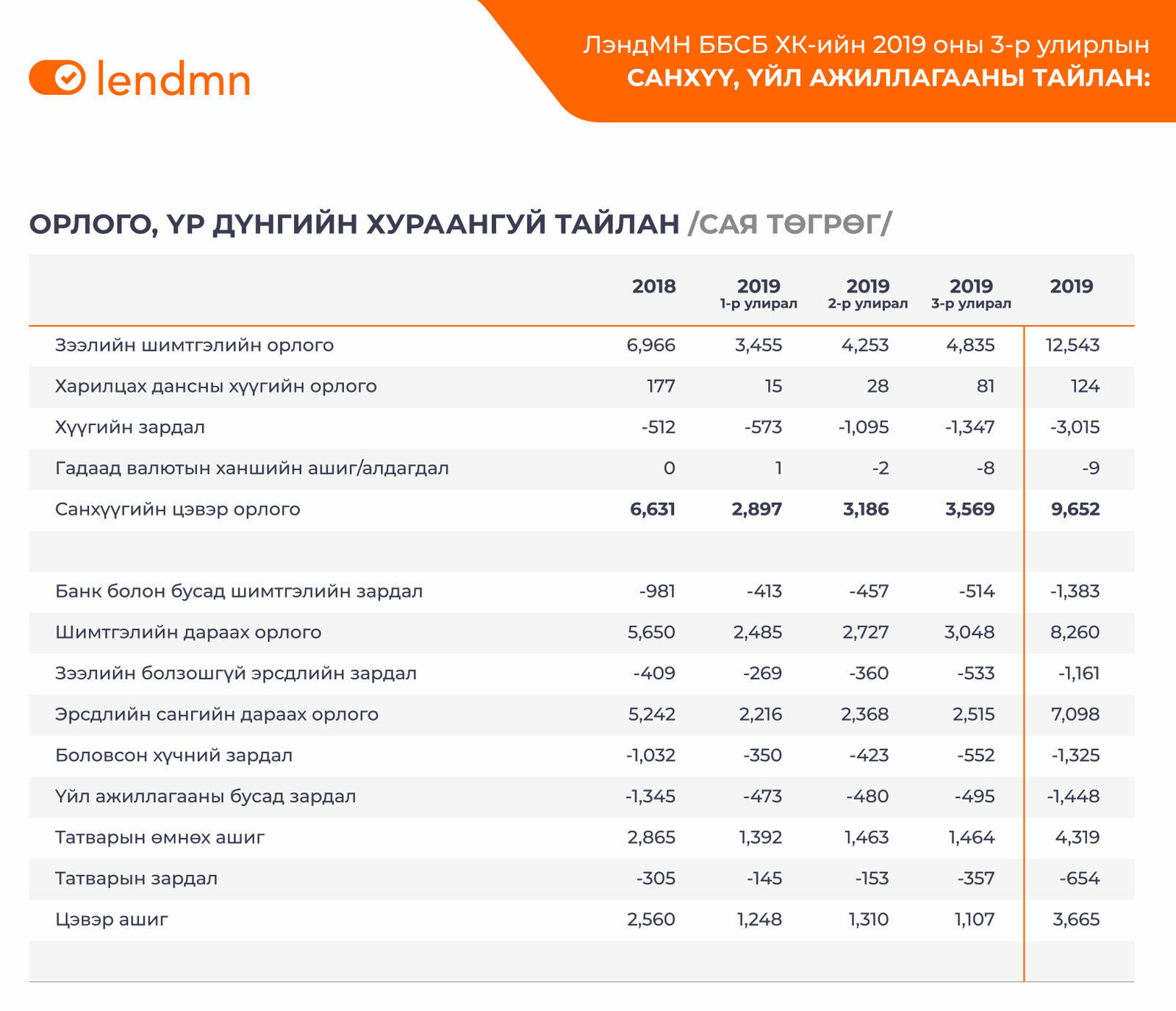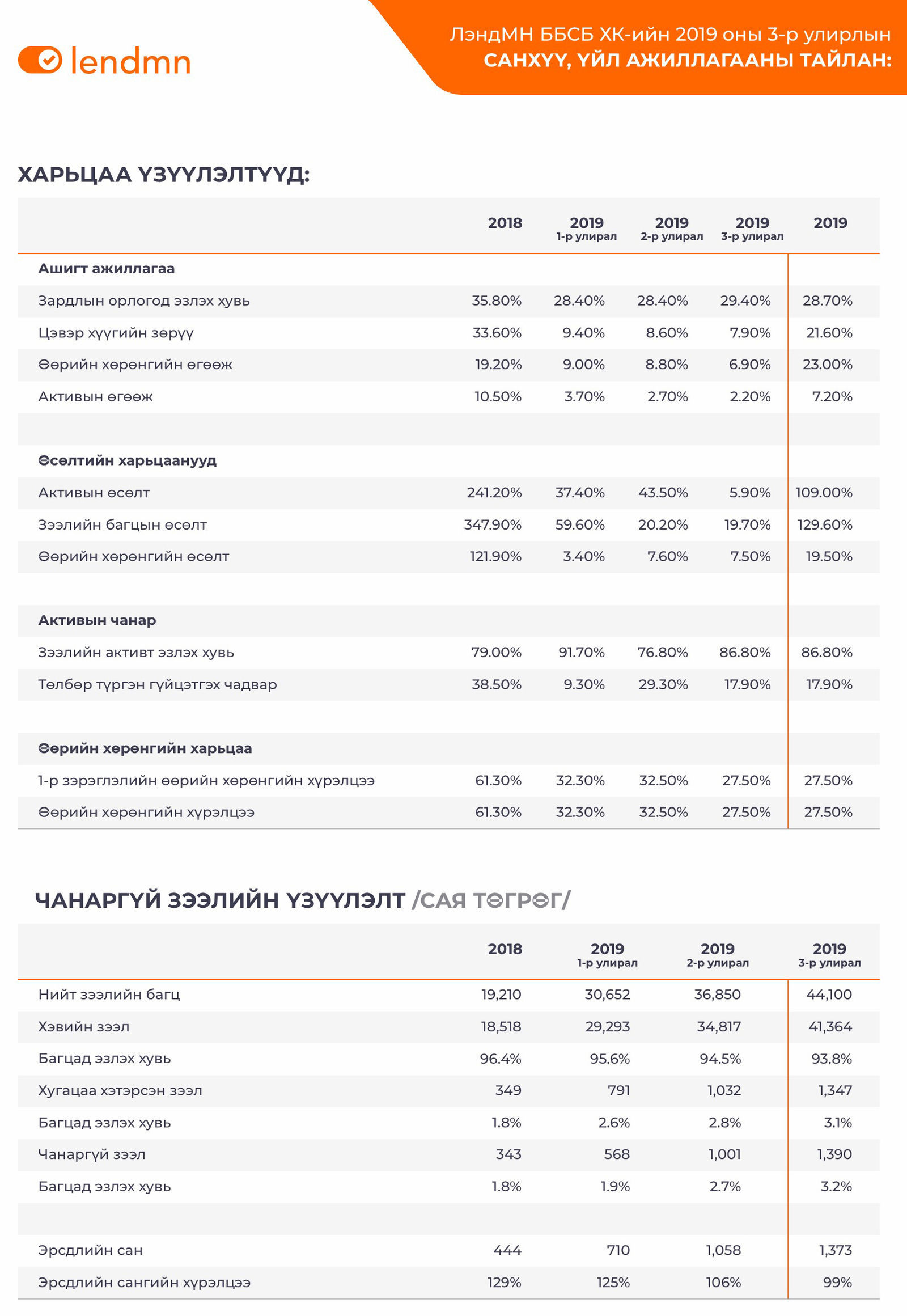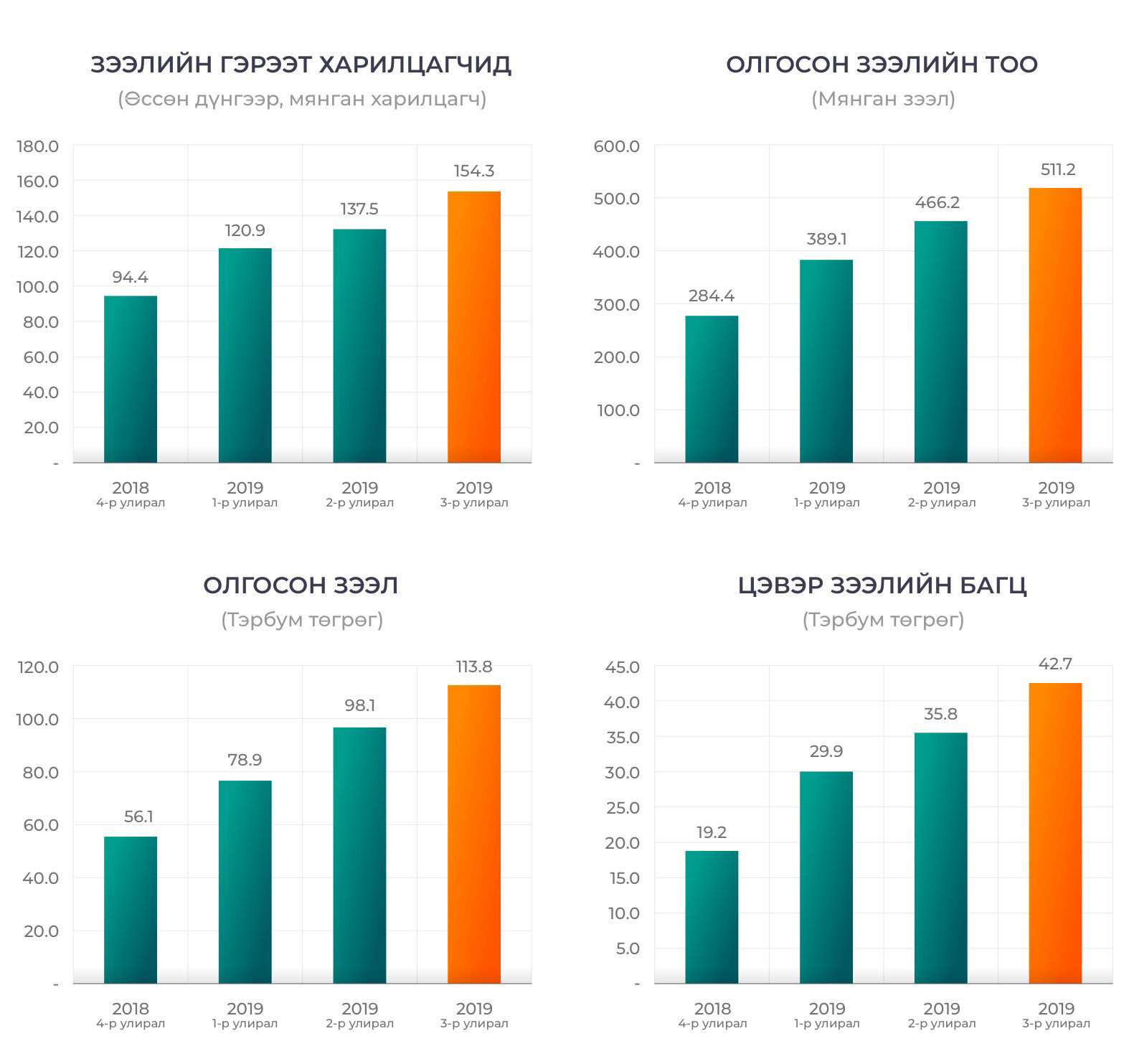 Компанийн зээлийн бүтээгдэхүүний үндсэн үзүүлэлтүүдийг өнгөрсөн улирлын тоон үзүүлэлттэй харьцуулахад Зээлийн гэрээтэй харилцагчдын тоо 12%, Олгосон зээлийн тоо 10%, Олгосон зээлийн дүн 16%, Зээлийн багц 19% тус тус өссөн үзүүлэлттэй байна.