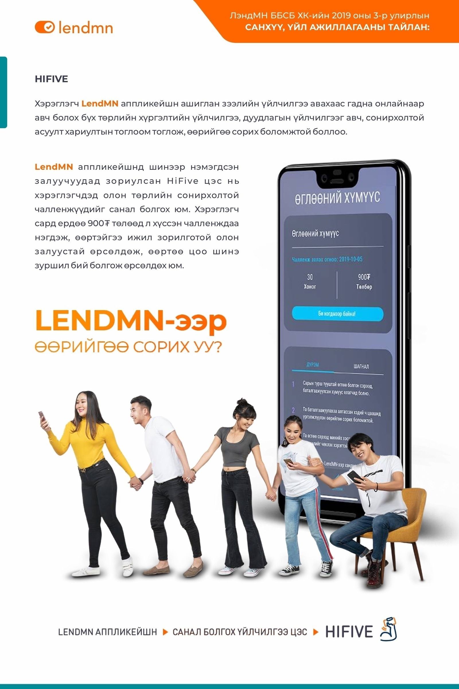 Бид хэрэглэгчдийнхээ хэрэгцээ шаардлагад нийцсэн зээлийн бүтээгдэхүүнийг зах зээлд туршиж, илүү дэвшилтэт, хэмнэлттэй байдлаар LendMN аппликейшнээр дамжуулан хэрэглэгчиддээ хүргэхээр зорин ажиллаж байна.