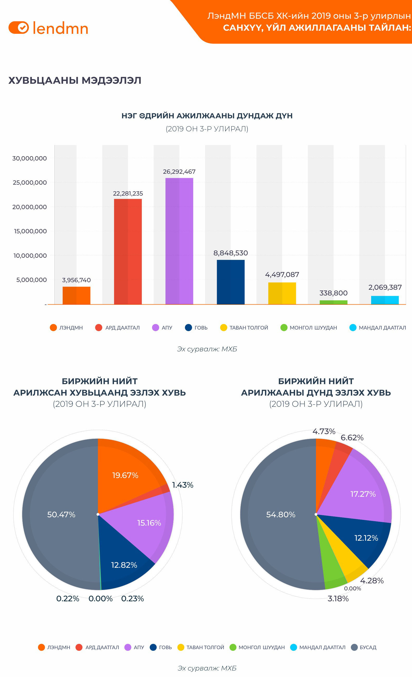 2019 оны 2-р улирлын байдлаар Банк бус санхүүгийн салбарын нийт зээл 1,097 тэрбум төгрөг байсанаас Хэвийн зээл 956 тэрбум (87.1%), Хугацаа хэтэрсэн зээл 43 тэрбум (3.9%), Чанаргүй зээл 97 тэрбум (8.9%) байсан.