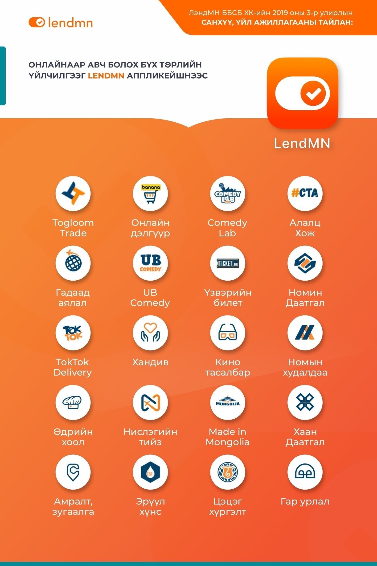 Хэрэглэгч зээлийн үйлчилгээ авахаас LendMN аппликейшны тусламжтайгаар 25 төрлийн онлайн бүтээгдэхүүн үйлчилгээг гар утсаараа авч, төлбөр төлөлтөө Лэнд хэтэвчээр илүү хялбараар хийж байна.