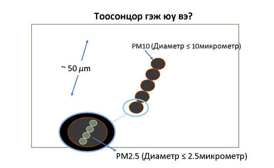 РМ10 /10 микрометрээс бага хэмжээтэй тоосонцор/ нь амьсгал, зүрх судасны замын өвчлөлд илүүтэйгээр нөлөөлдөг. РМ10-аас том хэмжээтэй нь хүний бие рүү нэвтрэхгүй.