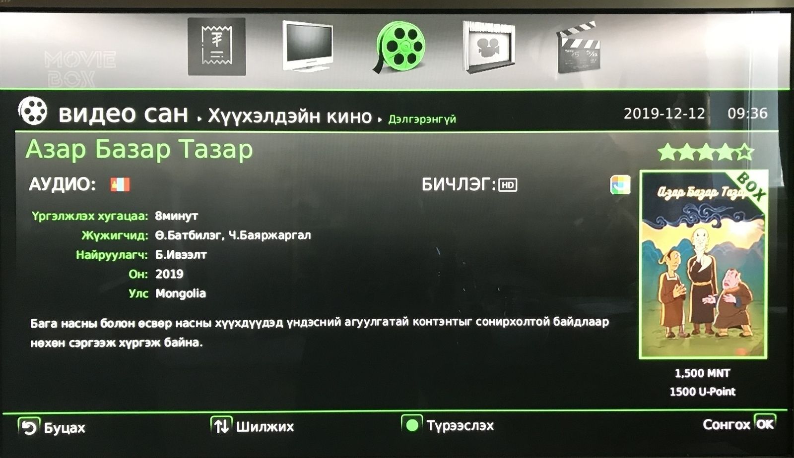 Та Азар Базар Тазар анимэйшныг Юнивишны Видео сангийн Хүүхэлдэйн кино хэсгээс 1,500 төгрөгөөр авч үзэх боломжтой.