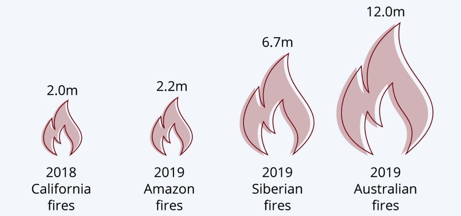 Сүүлийн 2 жилд л гэхэд дэлхийн ойн нөөц бүхий газруудад 4 том түймэр гарав. 2018 онд Калифорнид гарсан түймэр 2 сая акр газрыг хамарсан байна. 2019 оны 1-р сард дэлхийн хүчилтөрөгчийн 25 хувийг бүрдүүлэгч Амазоны ойд хүчтэй түймэр дэгдэв. Энэхүү гамшигт үзэгдэлтэй дуу авалцан ОХУ-н Сибирийн ойд гарсан түймэр нь 6.7 сая акр газар хамарсан байна. Улмаар агаар мандалд 49 мегатонн нүүрстөрөгчийн давхар исэл ялгарсан нь 36 сая автомашинаас ялгарах утаатай тэнцэхүйц хэмжээтэй гэжээ. Харин өнөөдрийг хүртэл үргэлжилж буй Австралийн түймэр нь Сибирьт гарсан түймрээс даруй 2 дахин их газар нутгийг хамраад байна. Австралийн түймрээс үүдэлтэй 24 хүн нас барж, хагас тэрбум амьтан устаж, 1400 байшин шатсан байна.