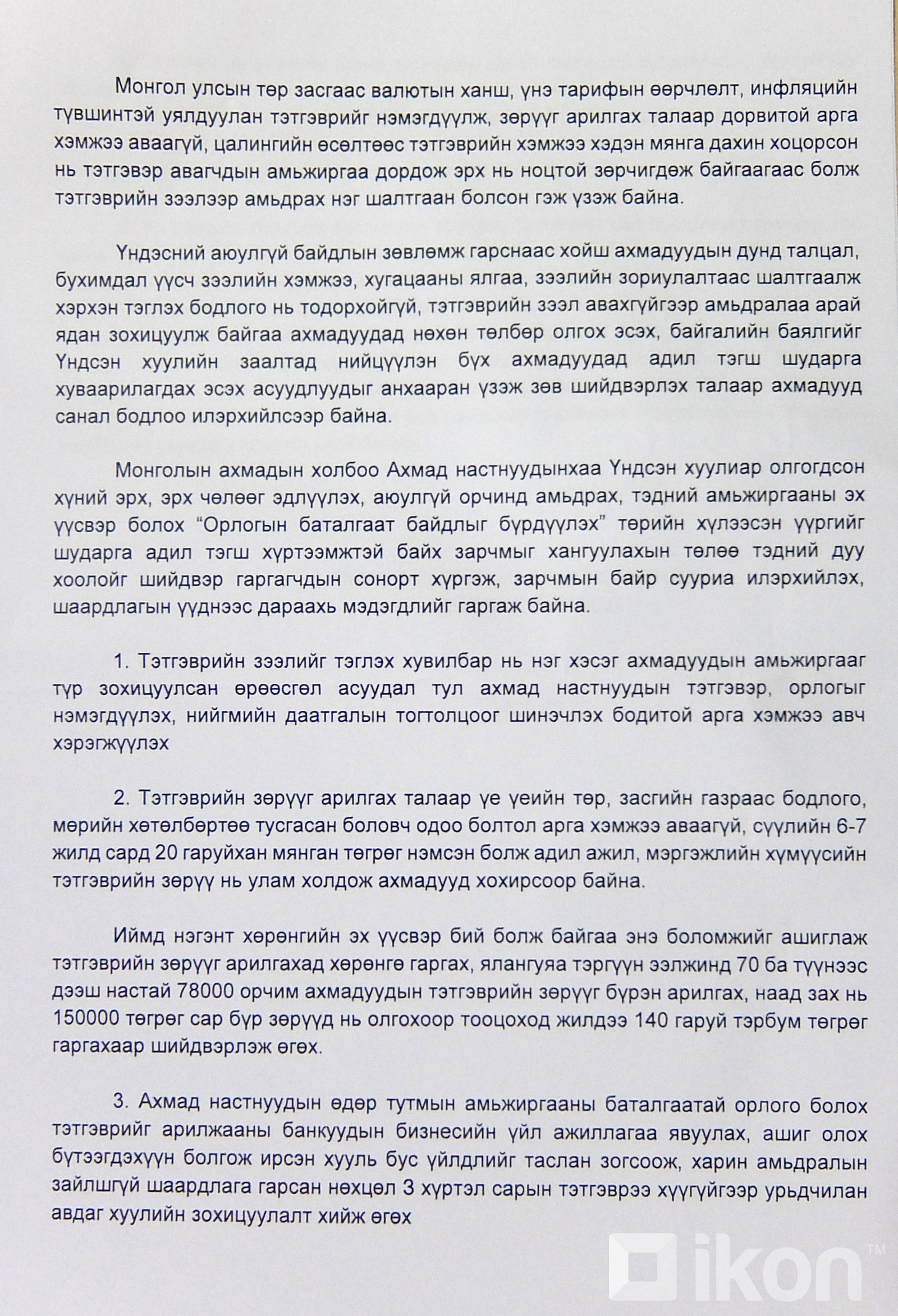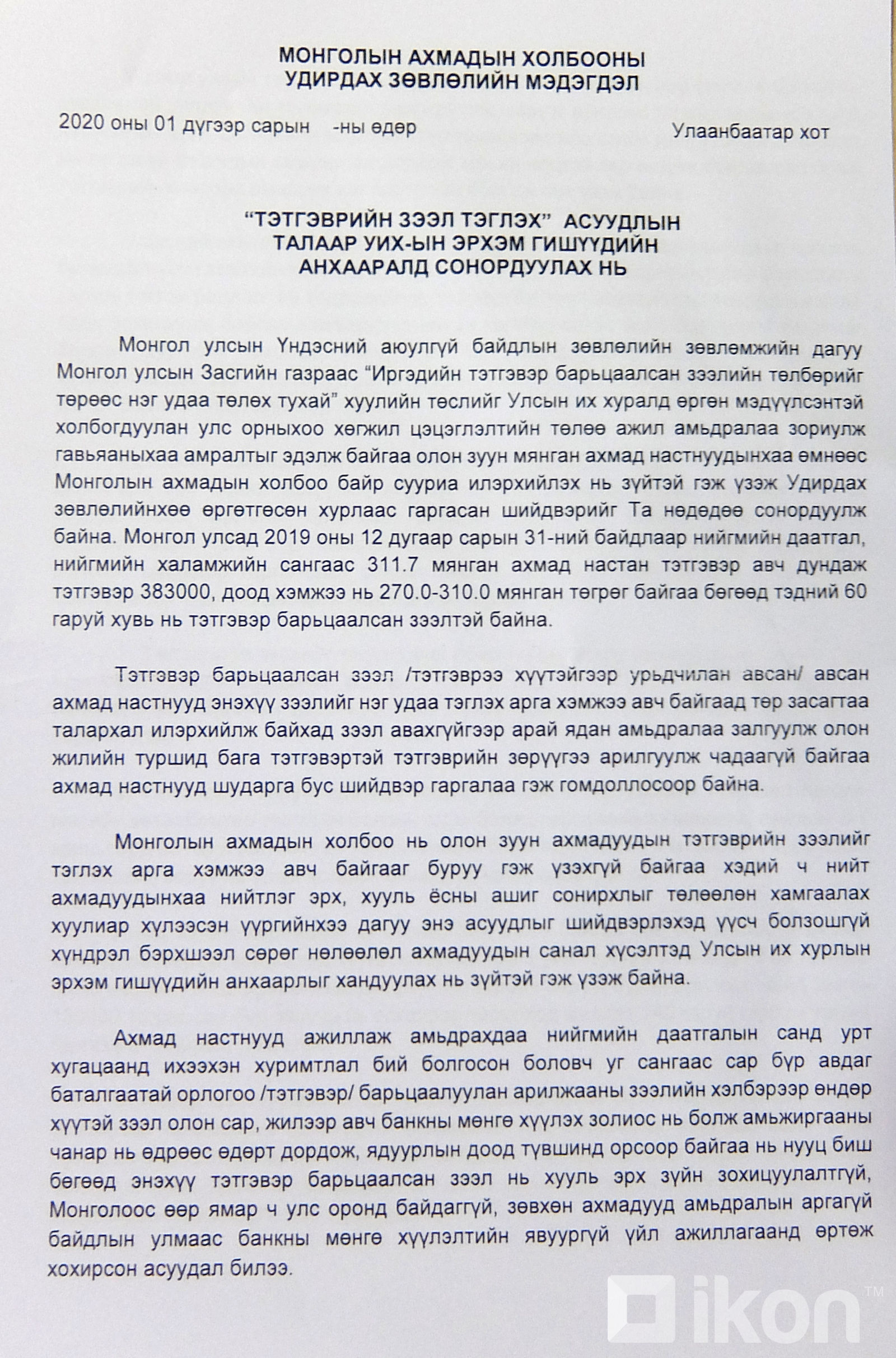 Ахмадын холбооны зүгээс цаашид тэтгэврийн зөрүүг арилгах, тэтгэврийн зээл олголтыг зогсоох, богино хугацаагаар хүүгүй урьдчилан авах нөхцөлийг бүрдүүлж өгөхийг хүсэж, УИХ-ын гишүүдэд зориулан сонордуулга гаргасан байна.