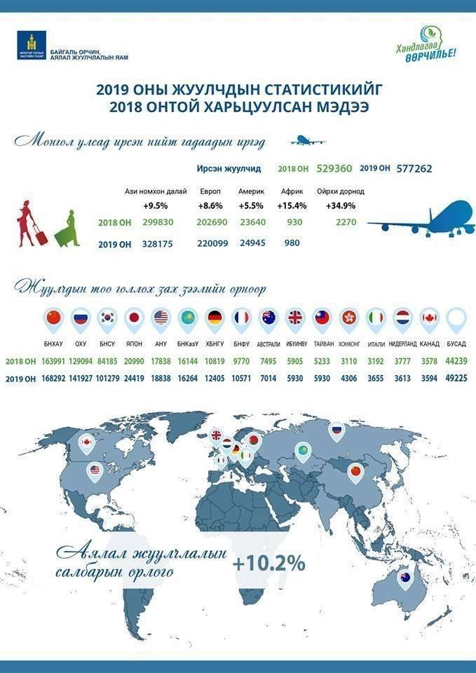 Манай улсад 2018 онд гадаадын нийт 529,360 жуулчин ирсэн бол 2019 онд 577,262 болж зорин ирэх жуулчдын тоо есөн хувиар нэмэгджээ.