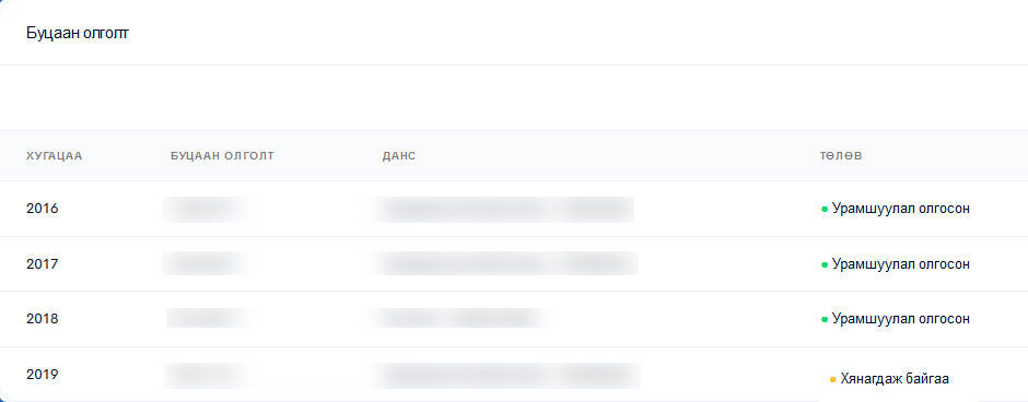 Хэрэв иргэн таны буцаан олголтын мэдээлэл "Хянагдаж байна" төлөвтэй байвал орон нутгийн иргэд харьяа Татварын албандаа, нийслэлийн иргэд Татварын ерөнхий газарт хандан эрсдэлд тооцож байгаа шалтгааныг тодруулж, асуудлаа шийдүүлснээр буцаан олголтоо бүрэн авах боломжтой.