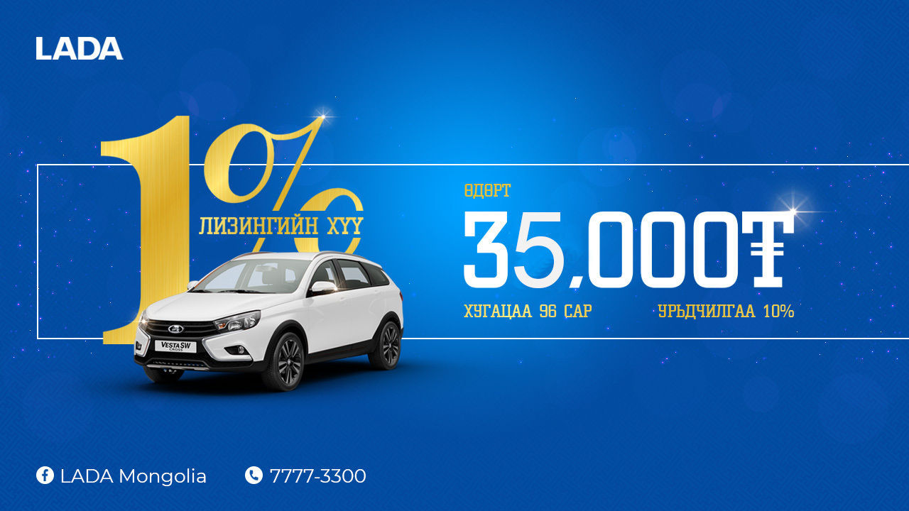 Харин өнгөрсөн 12-р сард, сар хүрэхгүй богино хугацаанд хэрэгжсэн “1%-ийн хүүтэй лизинг” хөтөлбөр энэ сард мөн дахин хэрэгжихээр шийдвэрлэгдсэн таатай мэдээ байна. Өөрөөр хэлбэл, та LADA Vesta SW Cross автомашиныг 10 хувийн урьдчилгаа төлөөд, сарын 1%-ийн хүүтэй, 96 хүртэлх сарын хугацаатай лизингээр худалдан авах боломжтой юм.