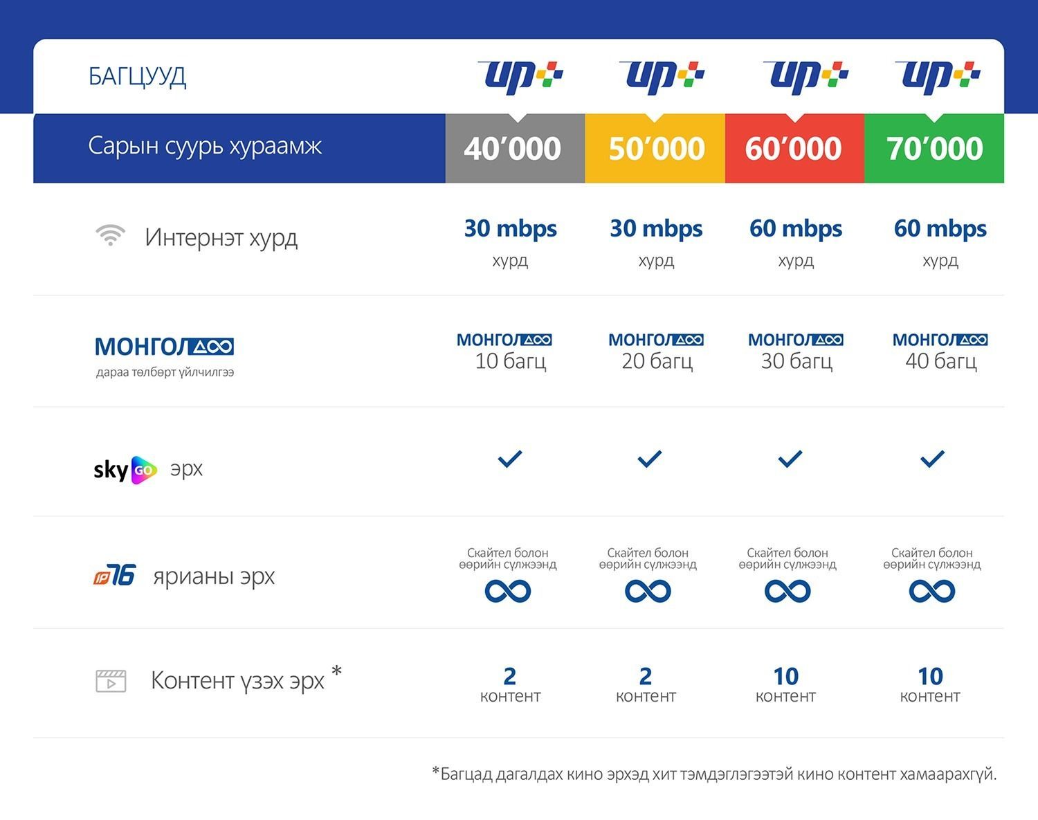 Тодруулбал “UP” үйлчилгээнд үүрэн холбооны дараа төлбөрт МОНГОЛдоо багц, өрхийн гуравласан үйлчилгээ болон SkyGO үйлчилгээ багтаж байгаа юм. Эдгээрийг нэгтгэснээр 10 дахин хурдан интернэт, гадаад дотоодын шилдэг телевизийн сувгууд, албан ёсны эрхтэй кино контентууд, хязгааргүй ярих боломжуудыг хаанаас ч хүссэнээрээ ашиглаж, зах хязгааргүй хэрэглээг чөлөөтэй ашиглах болно.