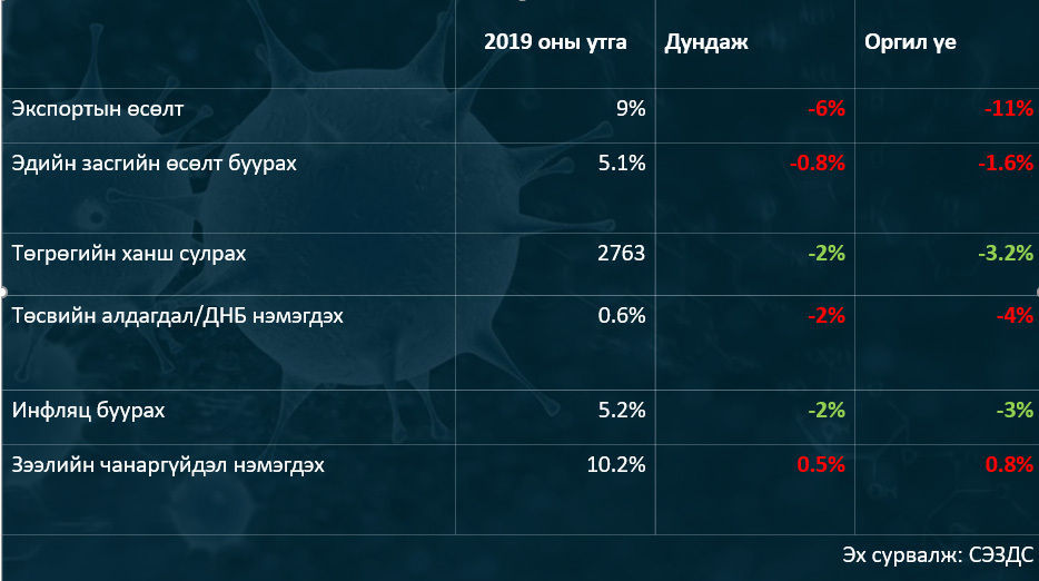 - Хоёрдугаар сарын эхний хагасын статистикийг харвал импорт 52, экспорт 61 хувиар буурчээ. Импортын энэ бууралт нь худалдааны салбар ямар хэмжээний уналтад ороод байгааг илтгэж байна. Экспорт мөн буурсан нь уул уурхайн салбарт нөлөөлж буй. Ингээд ДНБ-ий 40 орчим хувь, ажиллах хүчний 30 орчим хувь, банкуудын олгосон зээлийн 27 орчим хувийг эзэлдэг голлох салбарууд ийнхүү саарснаар ААН-үүд, өрхүүдэд сөргөөр нөлөөлнө. Гадаад худалдаанаас татварын орлого төвлөрүүлэхээс гадна ажиллаж байгаа компаниудаас төсвийн орлого бүрдүүлдэг Засгийн газрын хувьд төсөв бүрдэхгүй байх эрсдэл хүлээгдэж байна.