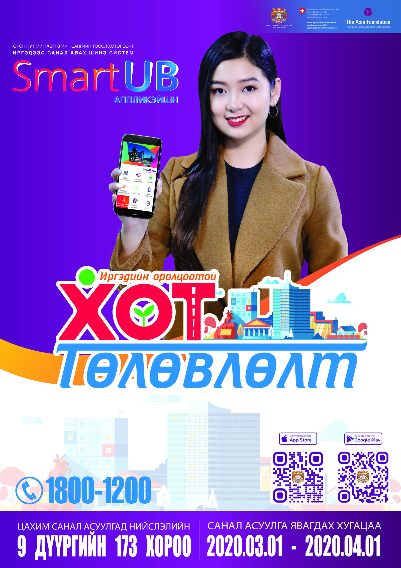 Орон нутгийн хөгжлийн сангийн цахим санал хураалтанд нийслэлийн 9 дүүргийн насанд хүрсэн иргэн бүр хамрагдах бөгөөд санал асуулга 2020 оны 3 сарын 1-ээс 4 сарын 1-ний хооронд явагдана. Иргэдийн хувьд ухаалаг утсан дээрээ SmartUB аппликейшнг татан суулгаж ОНХС гэсэн цонхыгсонгож санал асуулга гэсэн цэсэд хандсанаар өөрийн хороо дүүргийн хөгжил, бүтээн байгуулалтанд саналаа өгөх боломжтой юм.