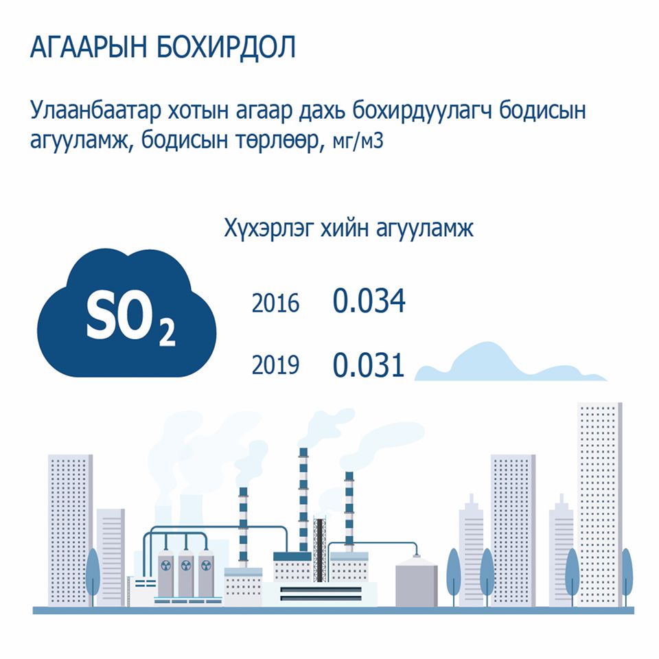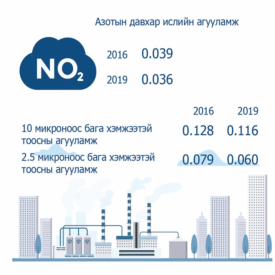 Улаанбаатар хотын агаар дахь бохирдуулагч бодисын жилийн дундаж агууламжийг бохирдуулагч бодисын төрлөөр авч үзвэл, 2019 онд 2016 оноос хүхэрлэг хийн агууламж 0.003 мг/м3 -ээр, азотын давхар ислийн агууламж 0.003 мг/м3 -ээр, 10 микроноос бага хэмжээтэй тоосны агууламж 0.012 мг/м3 -ээр, 2.5 микроноос бага хэмжээтэй тоосны агууламж 0.019 мг/м3 –ээр буурсан байна.