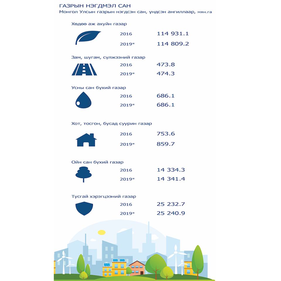 “Монгол Улсын нийгэм, эдийн засгийн байдал” 2016-2019 оны танилцуулгаас байгаль орчны мэдээллүүдийг хүргэж байна.