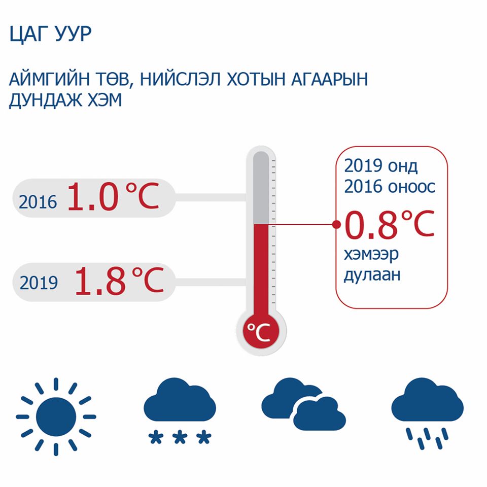 Улсын хэмжээнд зөвхөн өдрийн гэрэлтэй цагт ажиглалт хийдэг 181 харуул байдаг. Эдгээр харуулаас авсан ажиглалтын мэдээгээр жилийн дундаж агаарын температур 2019 онд 1.6 хэм байсан нь өмнөх оноос 0.4 хэмээр дулаан, 2017 оноос 1.1 хэмээр хүйтэн, 2016 онтой адил байсан байна.
