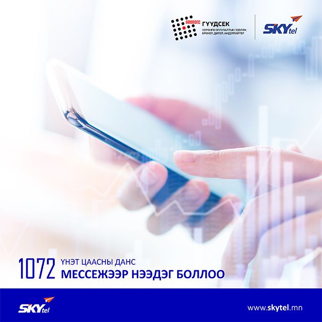 СКАЙтел компани нь Монгол улс дахь хамгийн олон харилцагчтай, цахим үйлчилгээг нэвтрүүлсэн “Гүүдсек ҮЦК”-тай хамтран үнэт цаасны данс нээх хамгийн хялбар шийдэл болох “ҮНЭТ ЦААСНЫ ДАНС МЕССЕЖЭЭР НЭЭХ ҮЙЛЧИЛГЭЭ”-г нэвтрүүлж байна. “Эрдэнэс Тавантолгой” ХК-ийн 1072 хувьцааны ногдол ашгийг 2020/05/01 өдрөөс эхлэн олгохоор болсон бөгөөд ногдол ашиг авах, “Эрдэнэс Тавантолгой” ХК-ийн хувьцаагаа өөрийн нэр дээр баталгаажуулахын тулд үнэт цаасны данс нээлгэсэн байх шаардлагатай. Та СКАЙтел компанийн дараа төлбөрт үйлчилгээний хэрэглэгч бол гар утсаараа мессеж илгээгээд үнэт цаасны данс нээлгэх боломжтой боллоо.