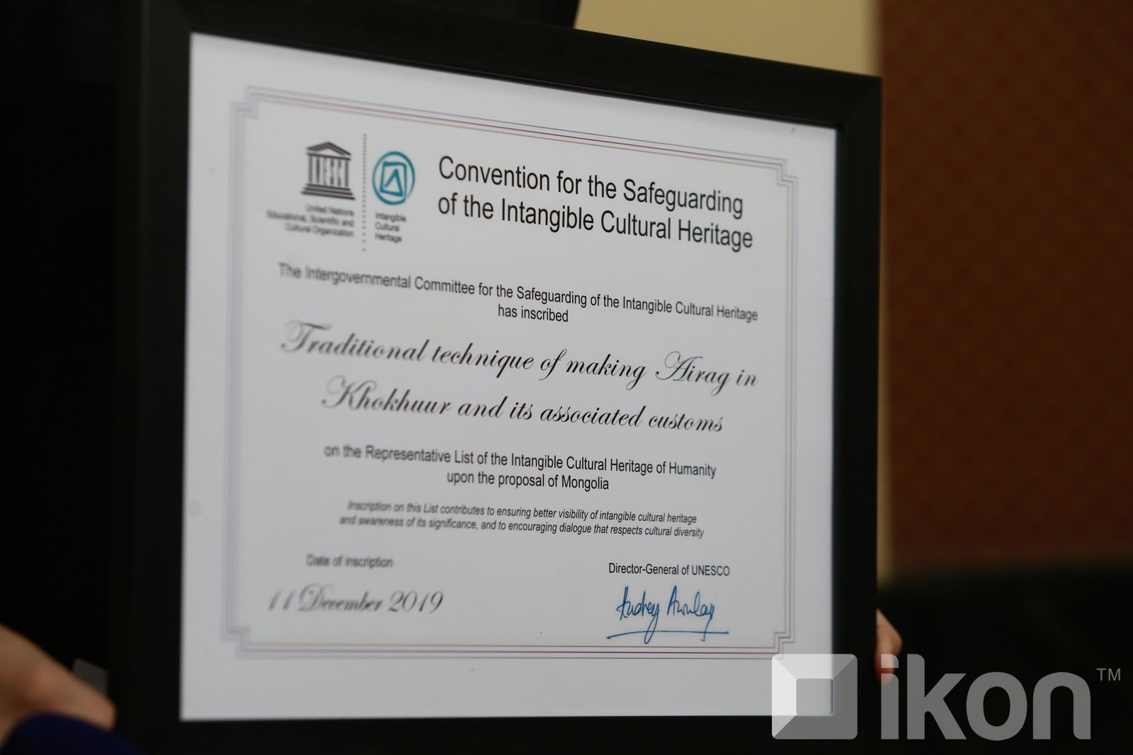 Гадаад харилцааны сайд бөгөөд ЮНЕСКО-гийн Үндэсний комиссын дарга Д.Цогтбаатар Монгол Улсаас ЮНЕСКО-гийн Хүн төрөлхтний Соёлын биет бус өвийн Төлөөллийн жагсаалтад бүртгүүлсэн “Хөхүүрийн айраг исгэх уламжлал, холбогдох зан үйл” өвийн батламжийг Боловсрол, соёл, шинжлэх ухаан, спортын сайд Ё.Баатарбилэгт гардууллаа.