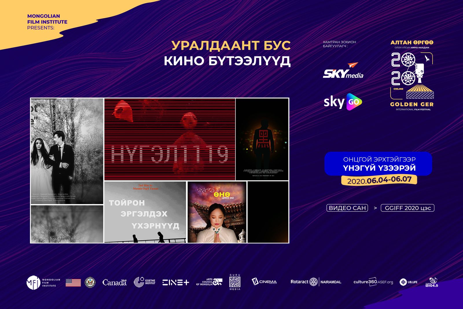 Кино наадмын хугацаанд СКАЙмедиа болон SkyGO-ийн видео санд “GGIFF 2020” кино цэс шинээр байрших бөгөөд та тус цэсээс наадмын шилдэг бүтээлүүдийг ҮНЭ ТӨЛБӨРГҮЙ үзээрэй. Харин 6-р сарын 8-наас эхлэн уралдаант хэсгийн кинонуудаас 1000₮-өөр үзэх боломжтой.