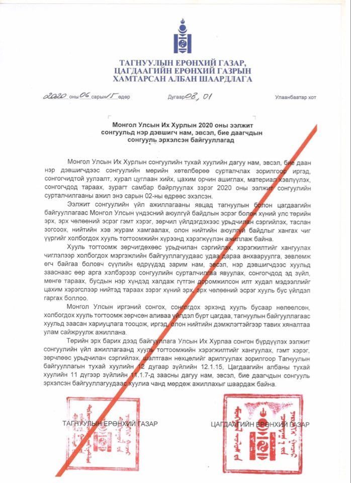 Иймд Монгол Улсын иргэний сонгох, сонгогдох эрхэнд хууль бусаар нөлөөлсөн холбогдох хууль тогтоомж зөрчсөн аливаа үйлдэл бүрт цагдаа, тагнуулын байгууллагаас хуульд заасан хариуцлага тооцох тул хуулийг чанд мөрдөж ажиллах хамтарсан шаардлагыг хүргүүлэв.