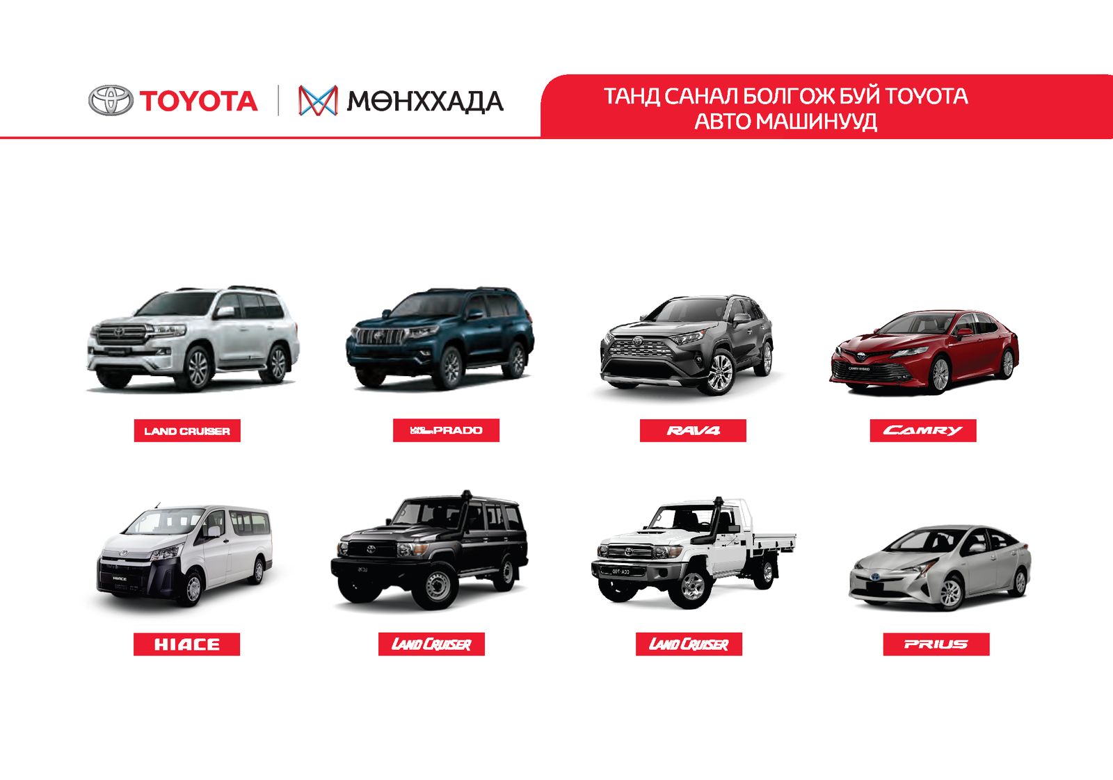 Бид монголчуудын дунд чанар эдэлгээгээрээ шалгарсан Япон улсын нэрийн хуудас болох Тоёота Мотор корпорацийн Land cruiser 200, Land cruiser 76, 78, 79, Prado, Rav4, Hiace, Granvia, Prius, Camry гэсэн 10 төрлийн автомашиныг Монгол орны эрс тэс уур амьсгал, замын нөхцөл, шатахуун, түлшний стандартад нийцсэн 3 жил эсвэл 100,000 км-н үйлдвэрийн баталгаатайгаар, албан ёсны дилерийн эрхтэйгээр эцсийн хэрэглэгчдэд хүргэдэг.