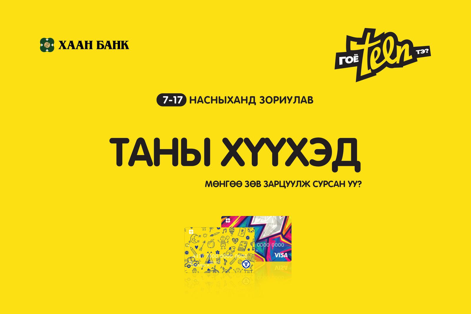 - Хүүхдэдээ өдөр тутамд нь хэрэглүүлэх TEEN карт үнэгүй захиалан, өөрийн хүссэн хаягаар хүргүүлэн авна.